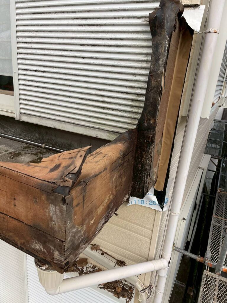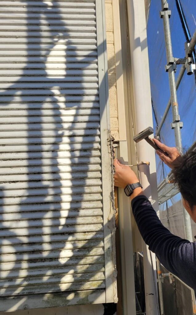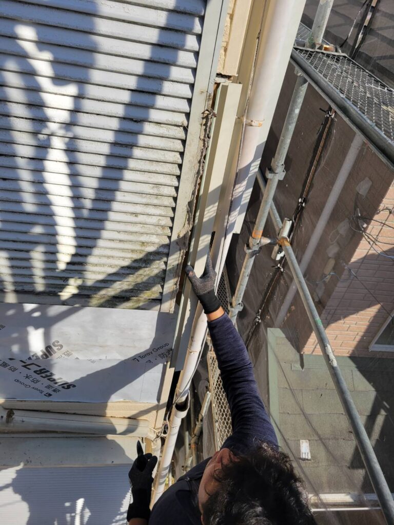 既存の木造ベランダを撤去した部分に新しくサイデイングの外壁を張るため、張り付ける部分に関わる箇所から施工していきます!