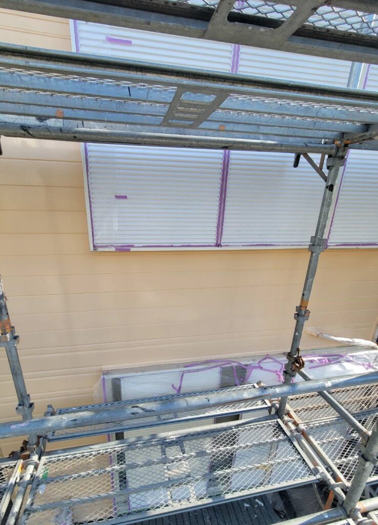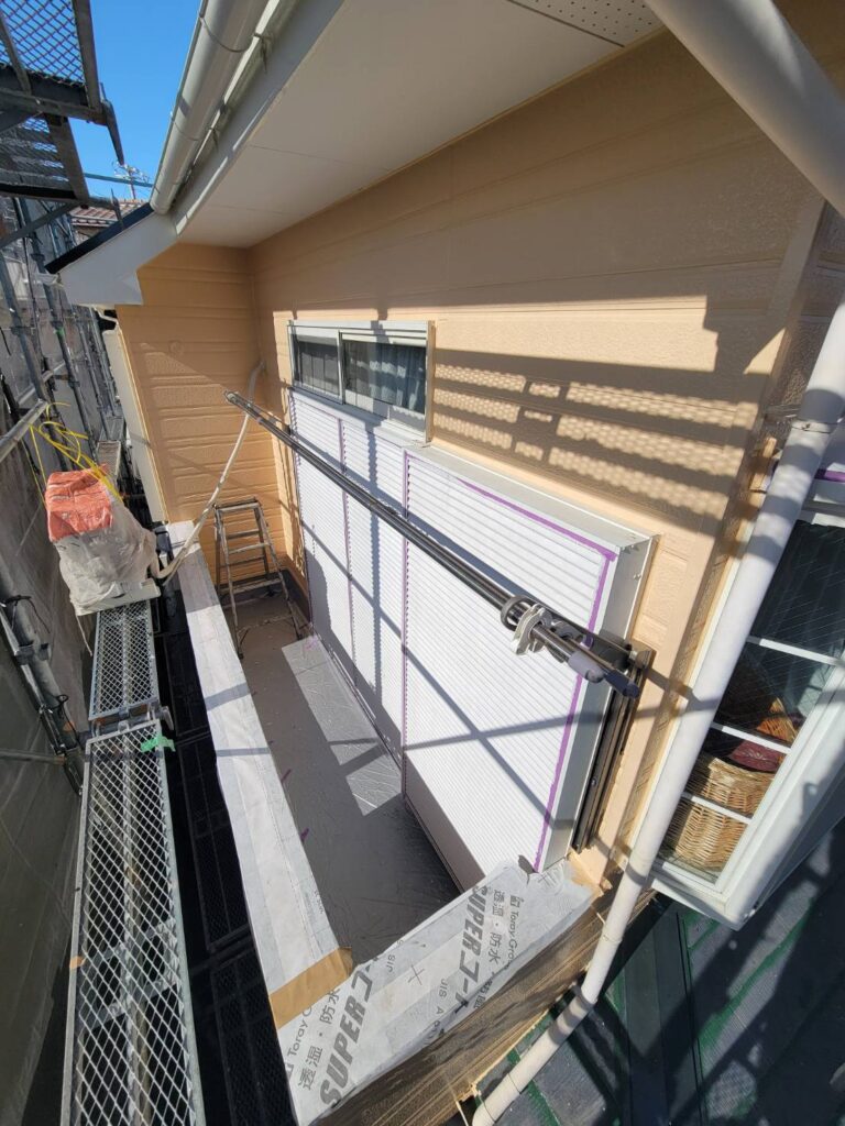 窓や戸袋をしっかり養生し、外壁のみ綺麗に塗り上げています!