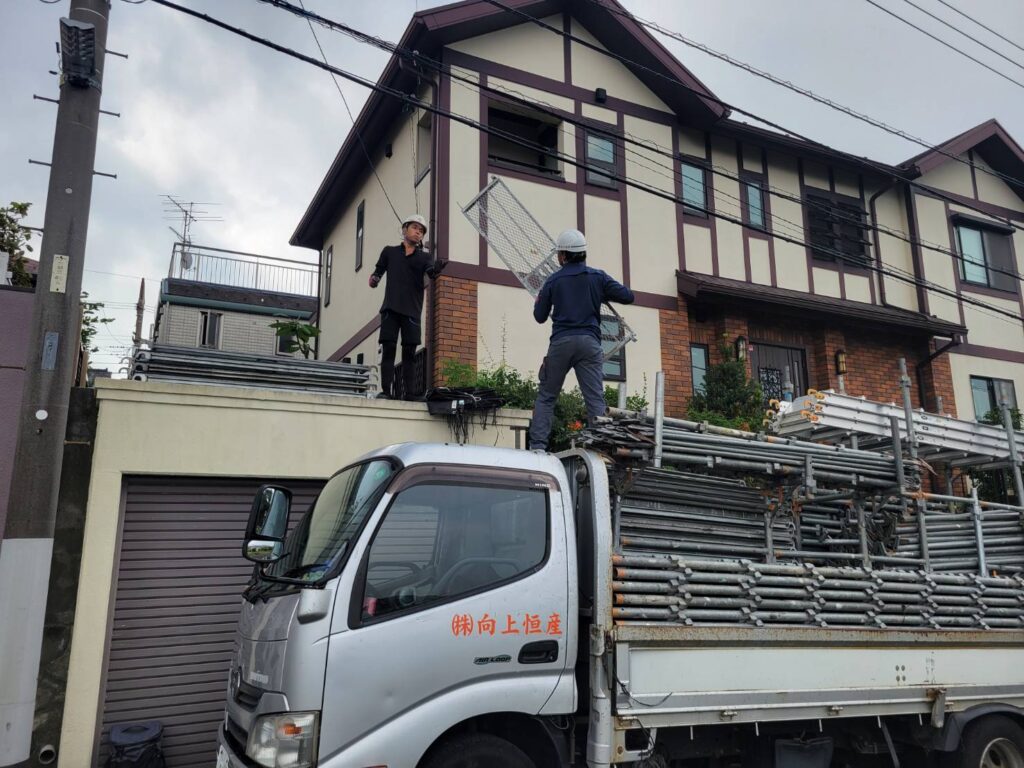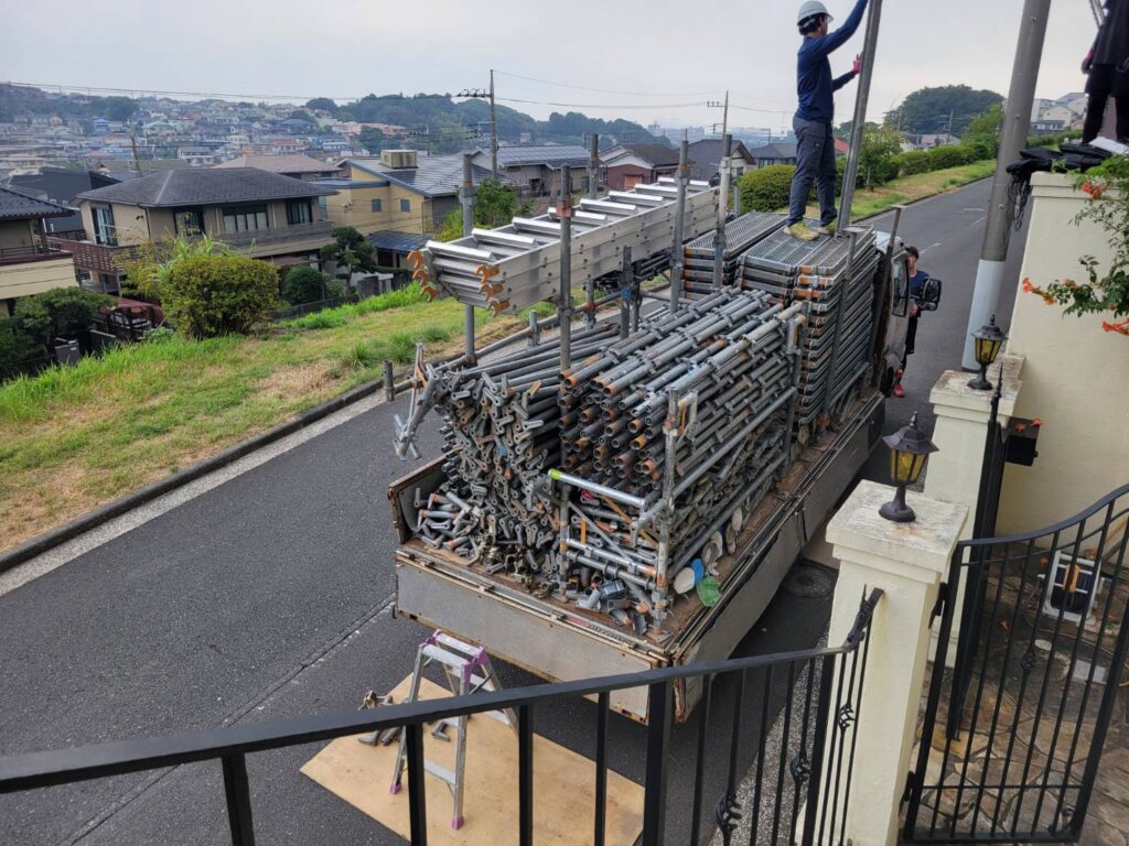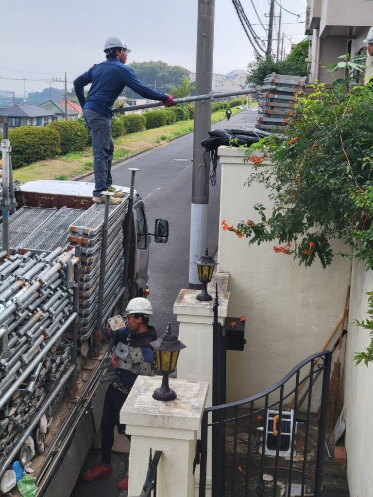 足場の業者さんと一緒に、施主様の協力もいただき物を除けていただいたおかげで順調に設置作業が進みます!