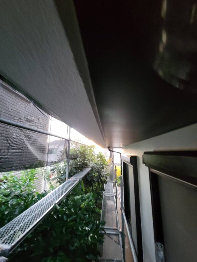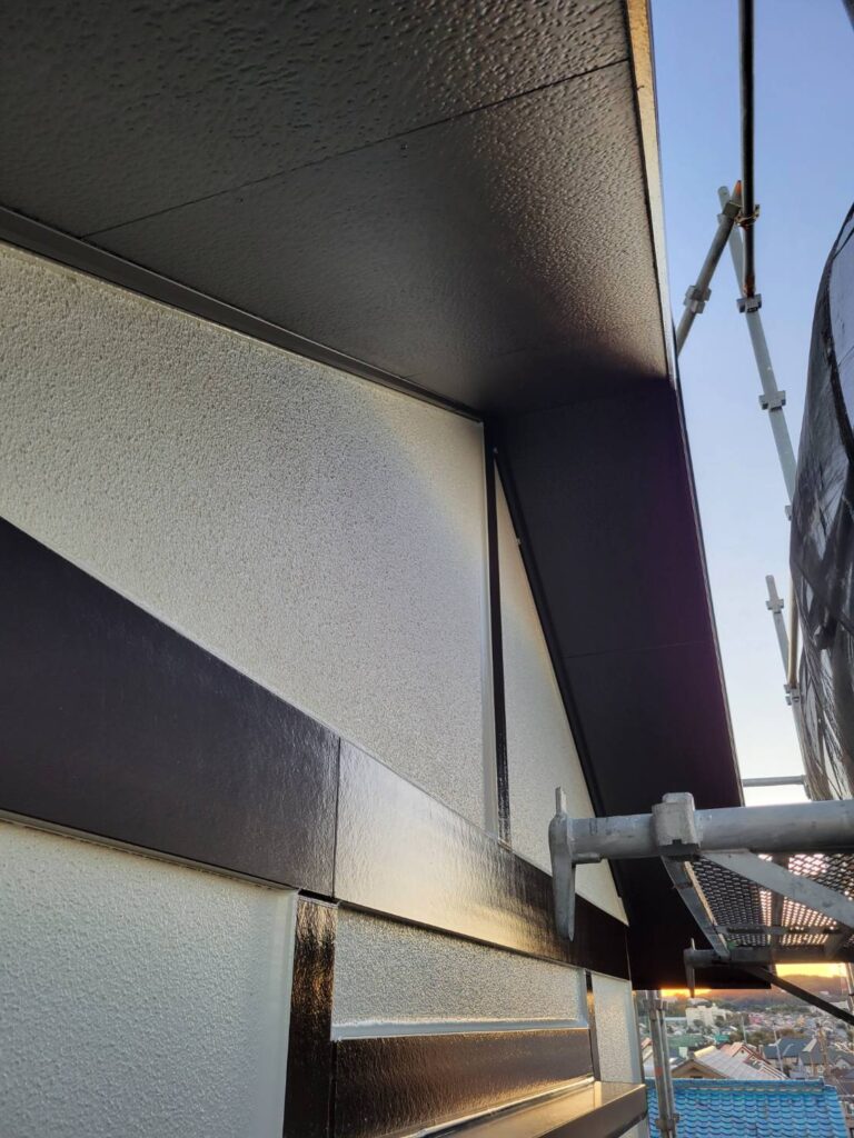 軒天や幕板など水平部も均一な塗膜が形成されており、光の反射が滑らかで美しい仕上がりです。