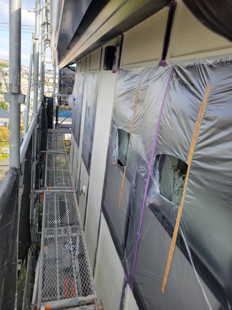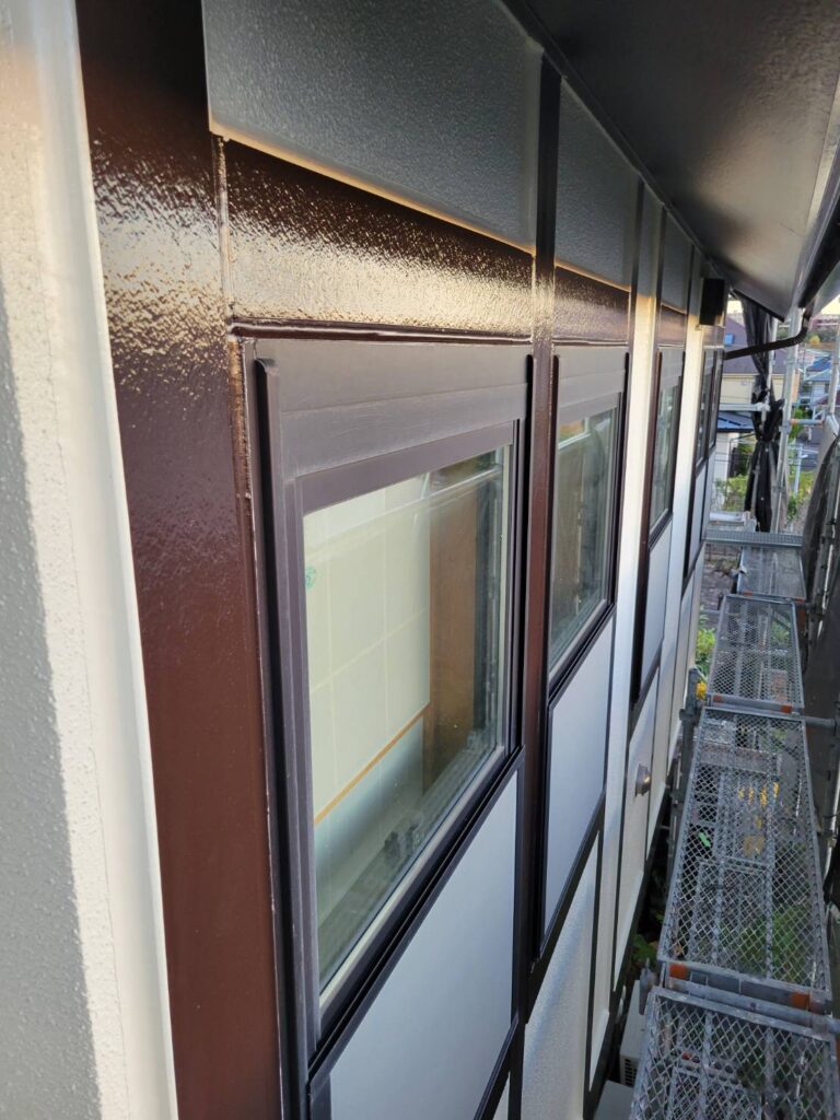 窓周りや配管まわりに施していた養生を外すと、塗り分けのラインがくっきりと浮かび上がり、外壁全体の表情が一気に引き締まりました!