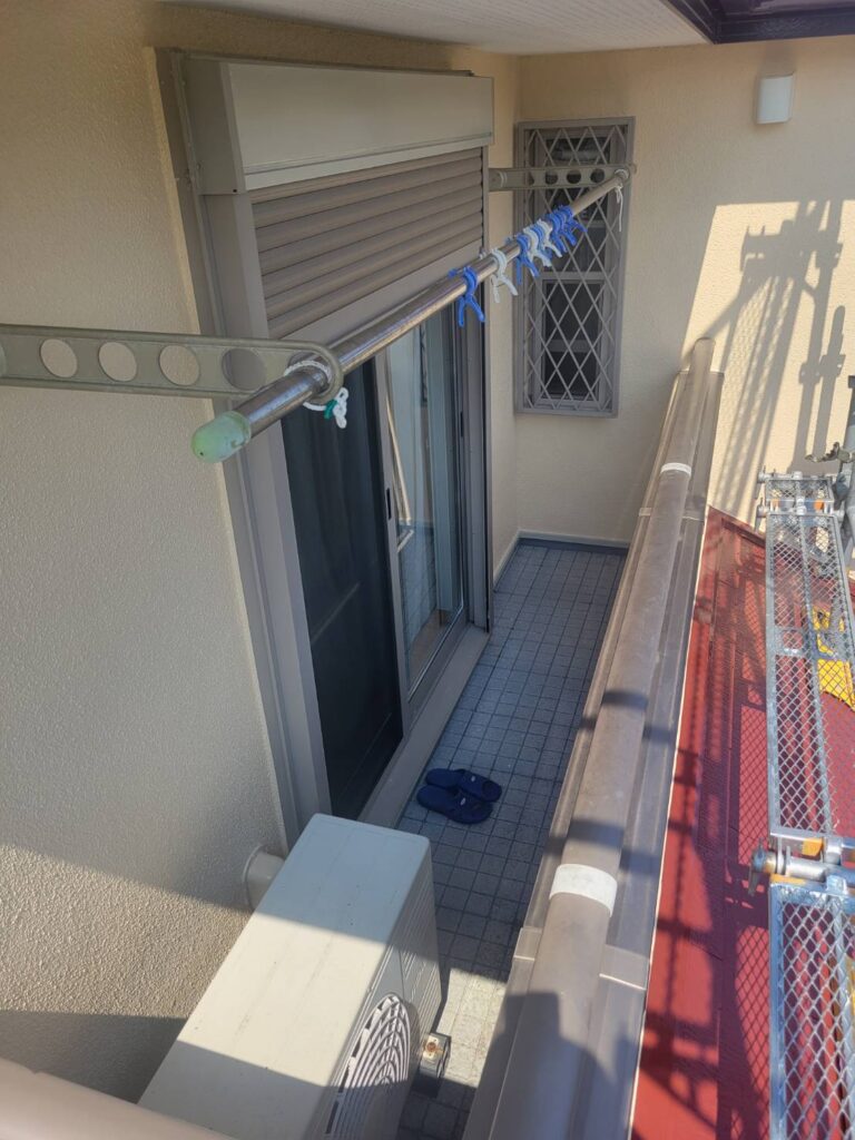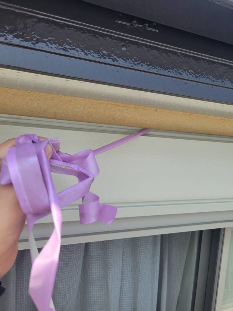 塗り終わってしばらく経ったので、外壁についたりしないように施していた養生のマスキングテープを剝がします。