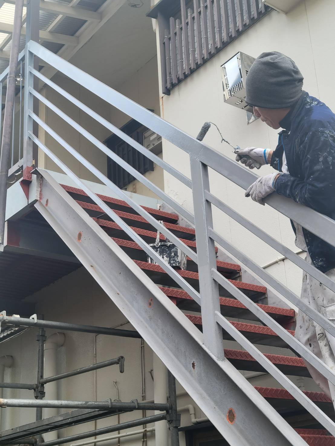 今回はアパートの手すりや階段全体の錆止め塗装が完了し、次の工程として上塗り塗装に入っていきますので、その模様をお届けします!