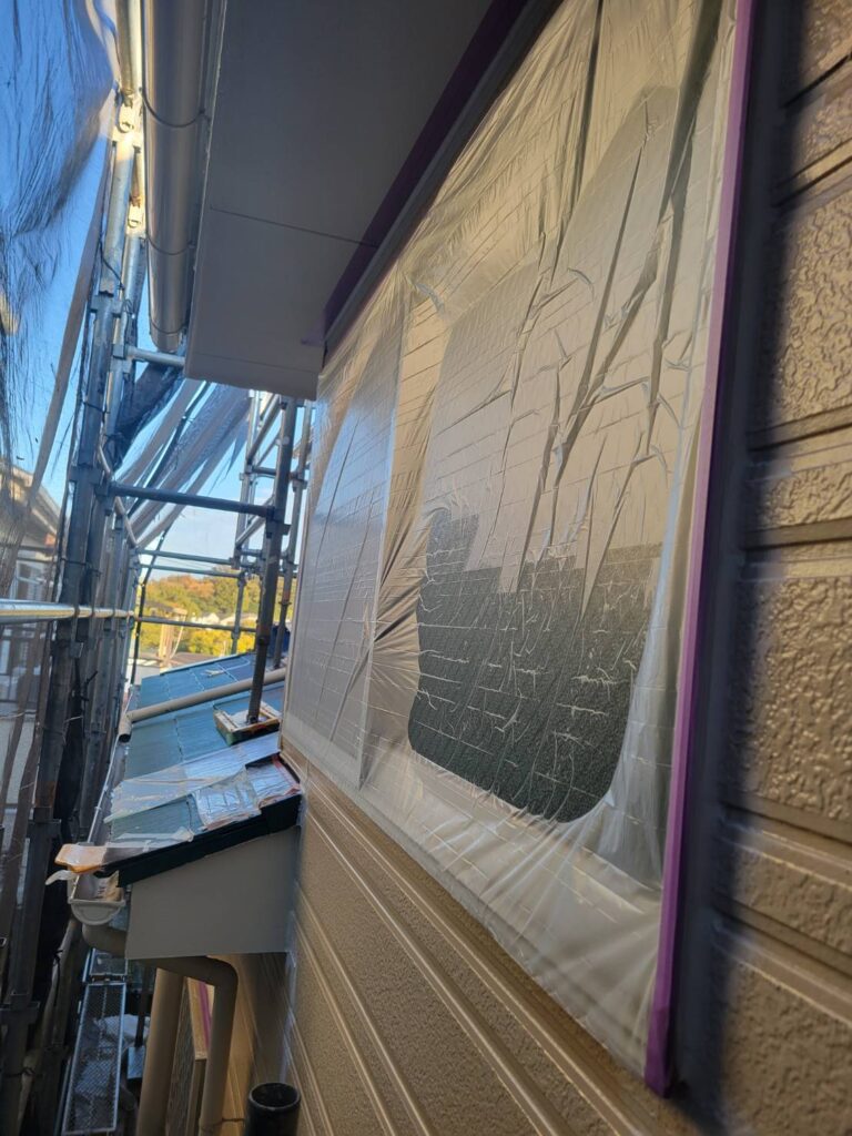 シーラーが乾いたので外壁の塗装に備えて各所の養生作業から始めました!