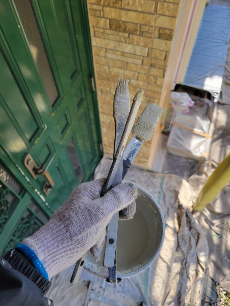 雨樋と破風板の隙間は非常に狭いので、画像にあるこれらの太さの異なる刷毛を使い分けて塗装します!