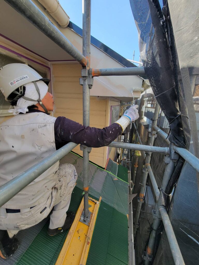 現在、施工中の富岡東・住宅街の現場で外壁塗装工事に勤しんでおります!