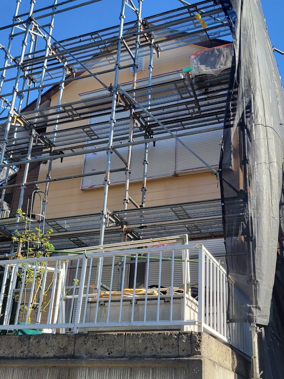 淡いベージュの外壁が日光を受けてふんわり明るく見え、仕上がりの美しさが足場越しでも伝わってきます。