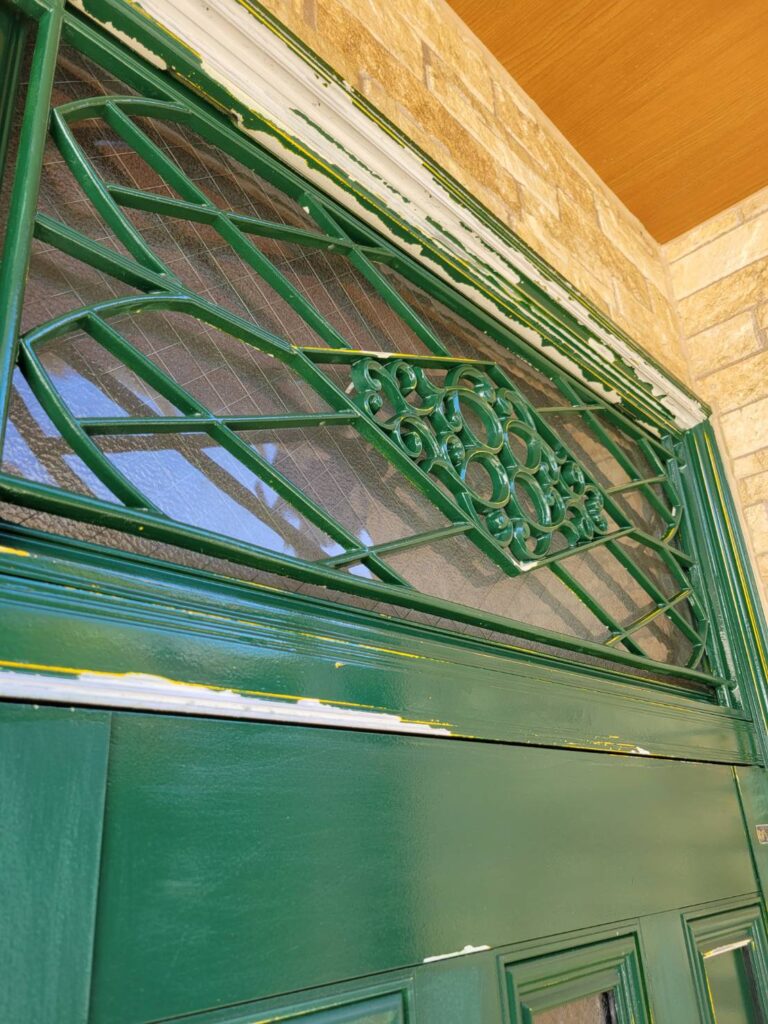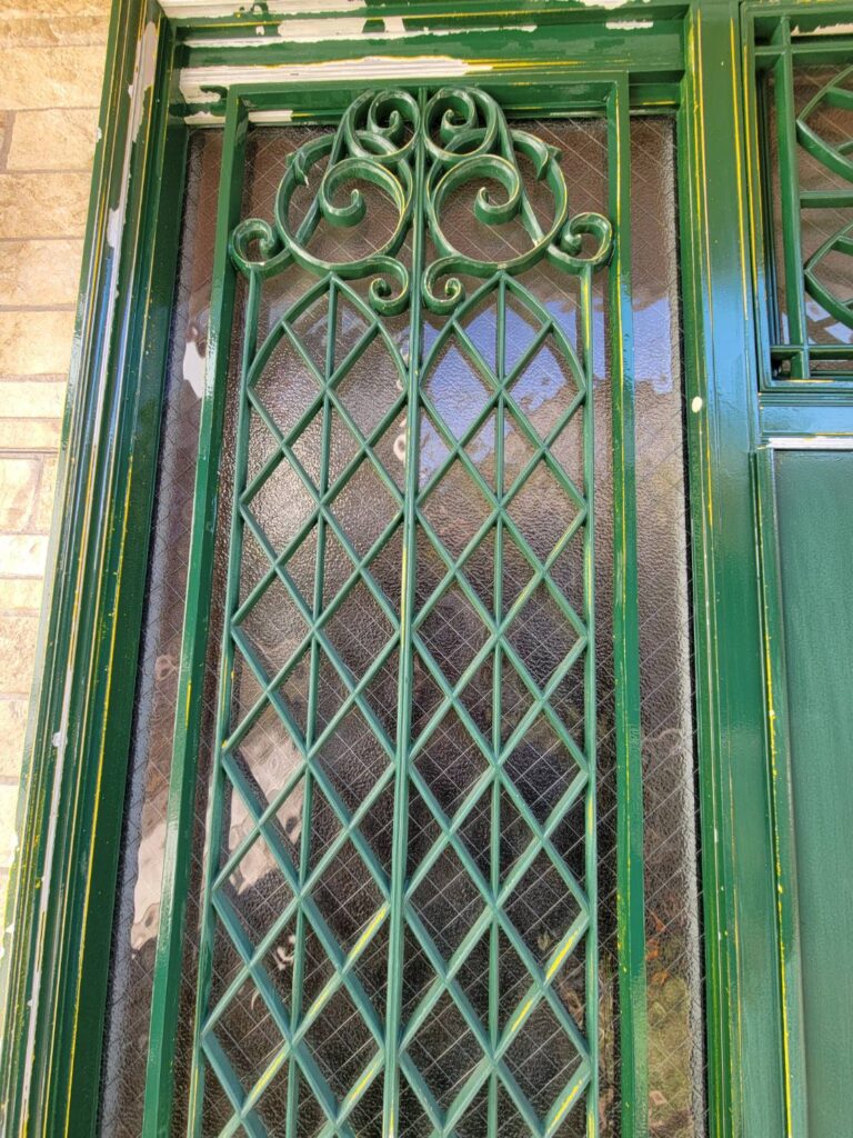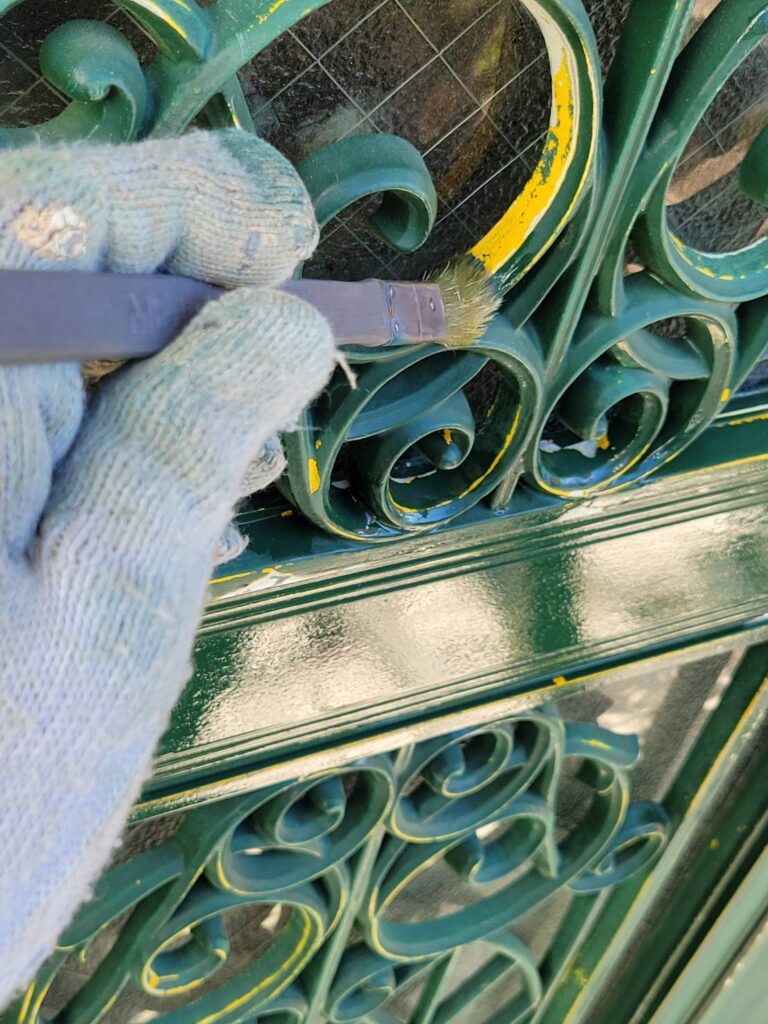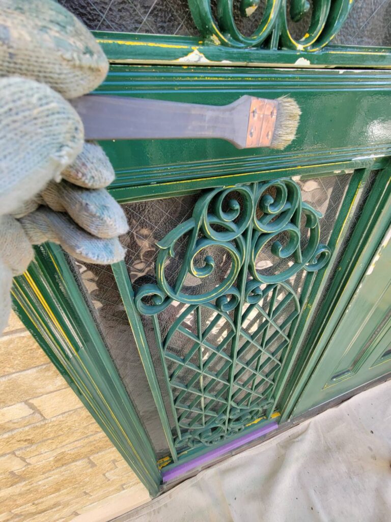 玄関まわりの下塗りシーラー作業。まずは細かい飾り格子から
