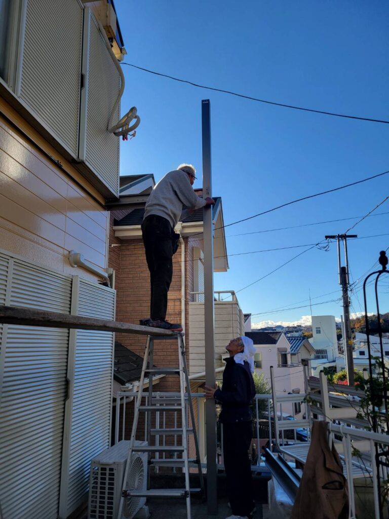 ベランダの強度に直結する重要な工程のため、取り付け角度やビスの入り具合までしっかり確認しながら作業が進みます!