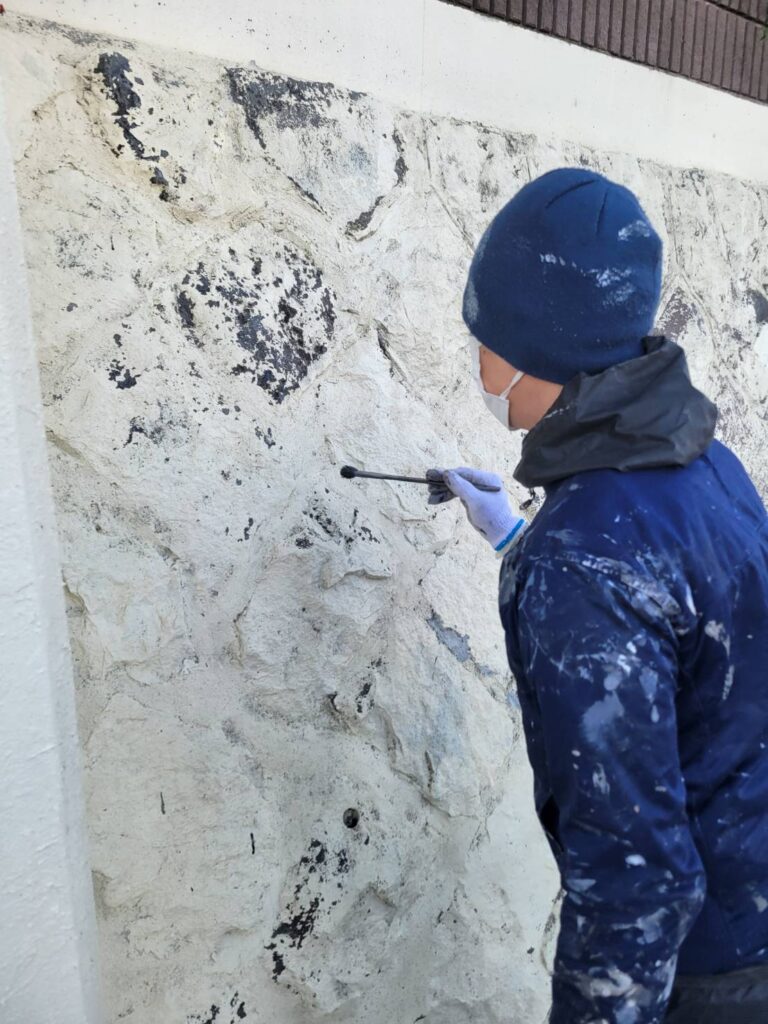 段々と色が理想に近づいてきたところで、擁壁に刷毛でチョンと試し塗りを行い、実際の見え方を確認します!