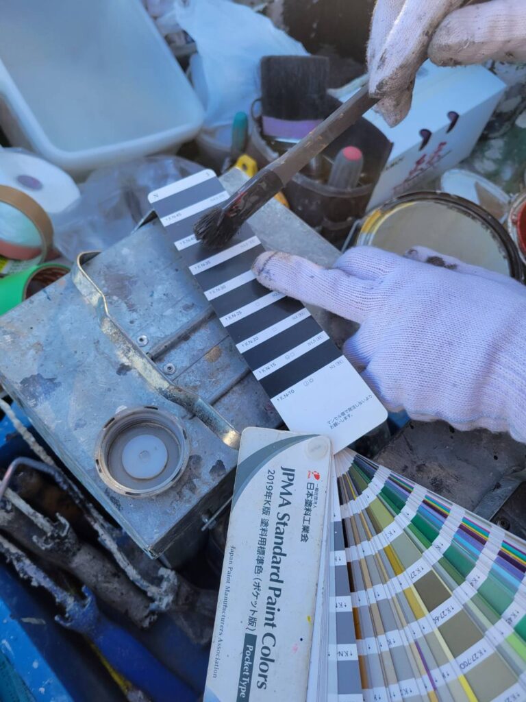 前回に引き続き、富岡西の現場にて間知石擁壁の試し塗りに向けた調色作業を行いました。