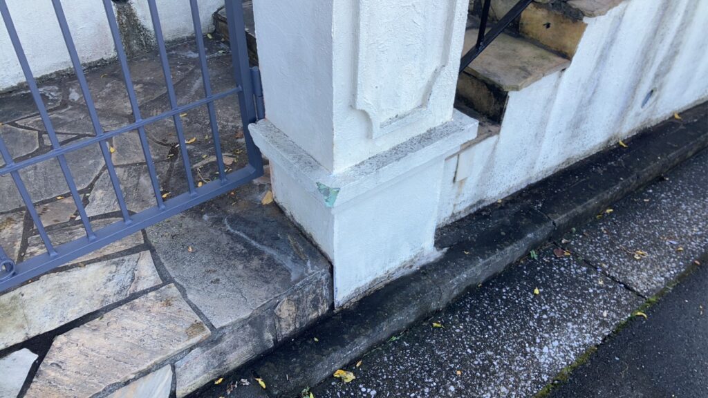 現場を確認すると、門扉の柱や擁壁の角部分が欠けてしまい、