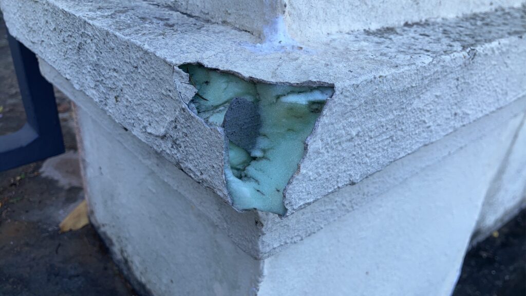 これは、擁壁や柱の内部に使われている軽量骨材や発泡系の下地材で、表面のモルタル層を支える役割をしています。