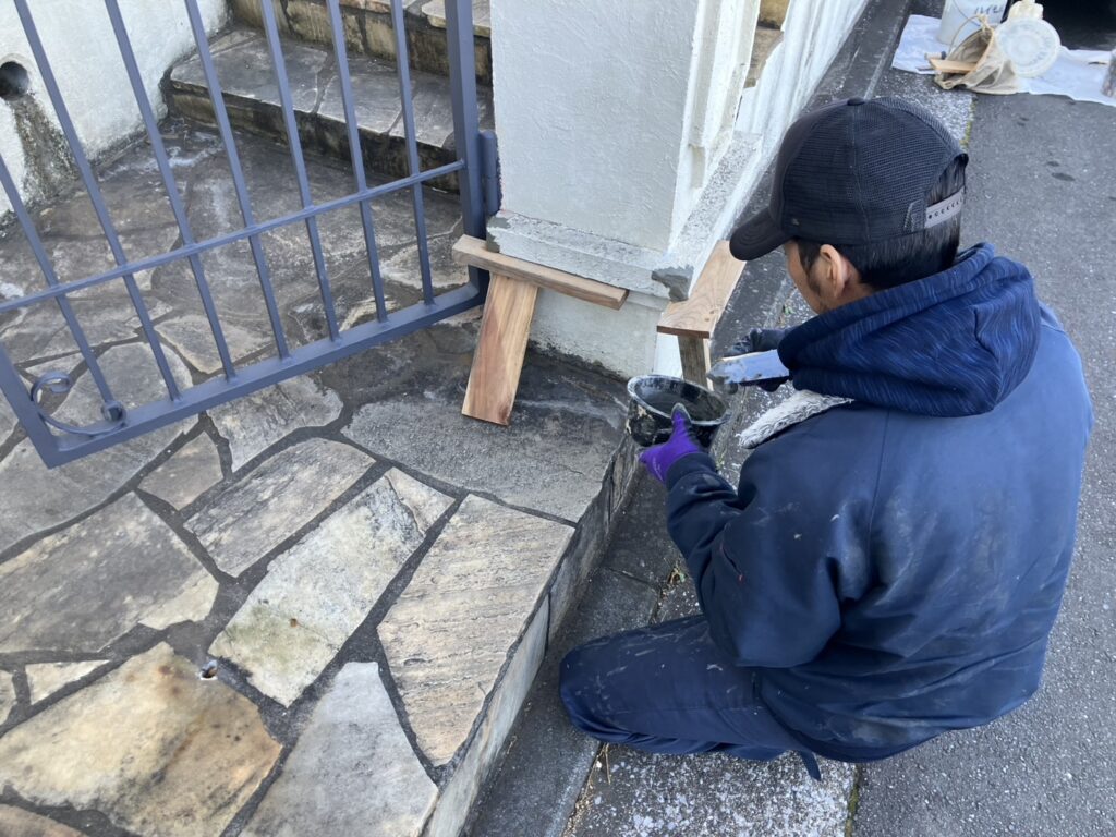 それに付随して塗装工事に入る前に門扉の柱および周辺の擁壁に発生していた欠けや、破損部分の修繕作業を行いましたのでその様子をご紹介します!