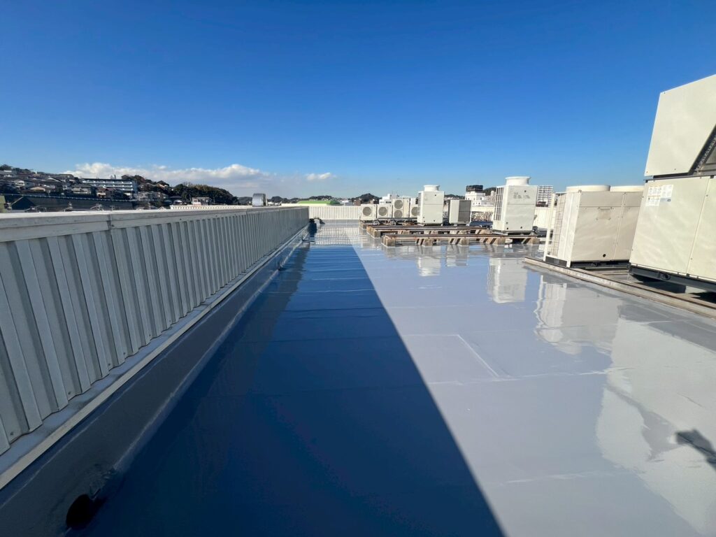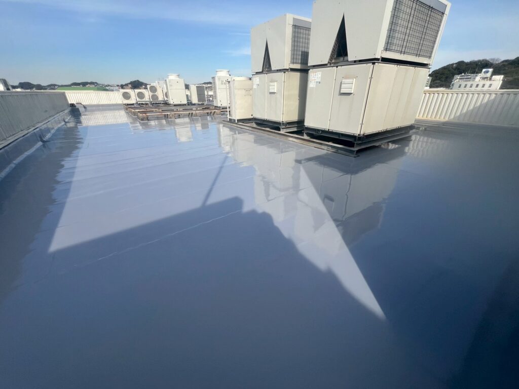 見た目にもウレタン防水の膜がしっかり形成され、屋上全体が引き締まった印象になりました!この工程にも1層目と同じくらいの日数を要しましたが、天候にも恵まれ、作業は終始順調に進みました!