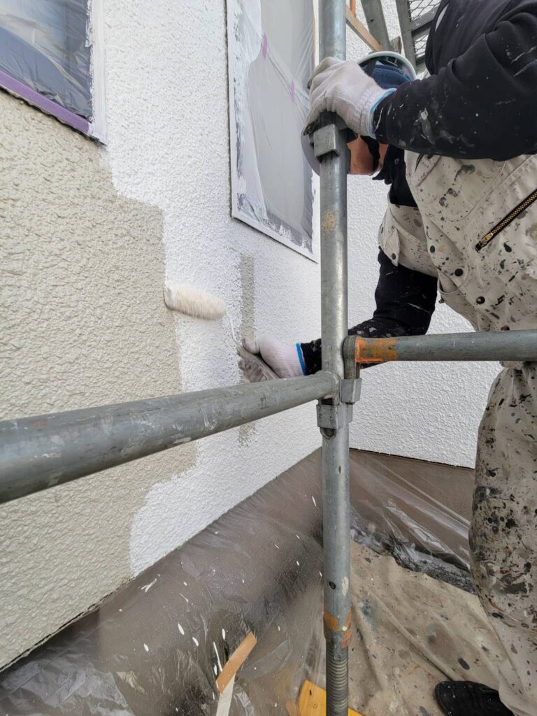 養生が完了すると、いよいよ外壁の中塗り施工開始です!