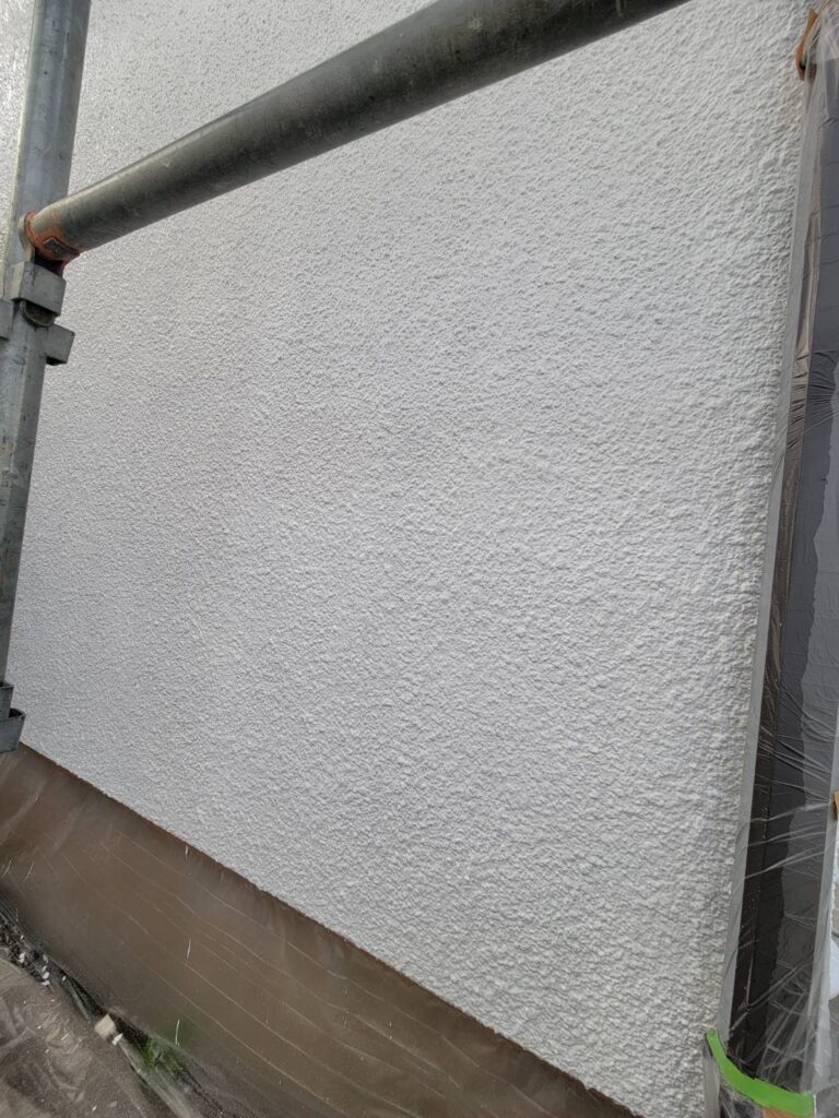 最後の写真では、中塗りが完了した外壁の状態をご確認いただけます。