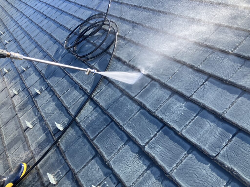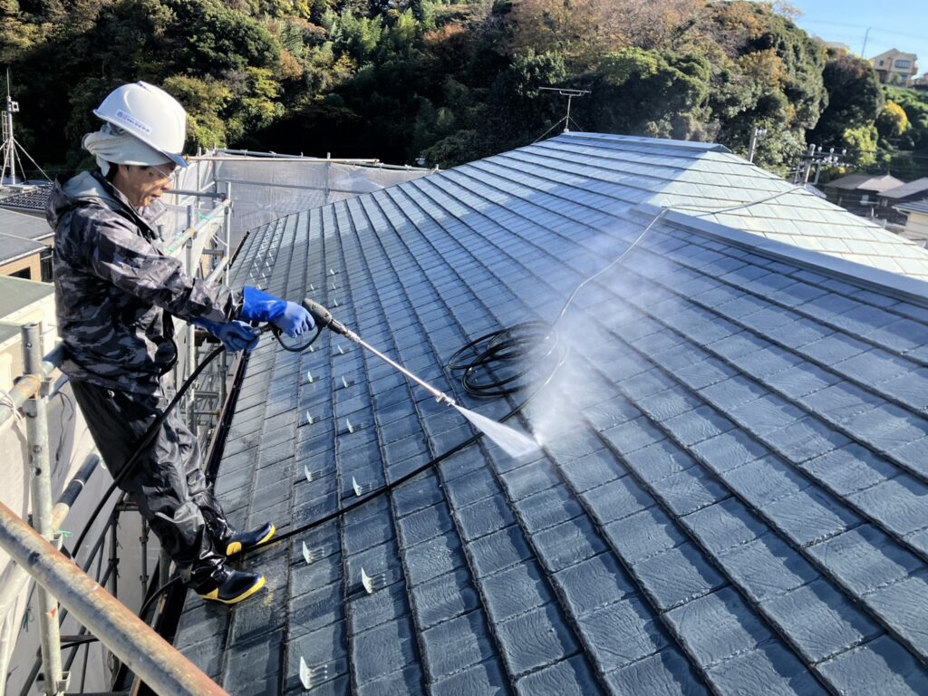 高圧洗浄は、長年蓄積した汚れや苔、古い塗膜を落とす大切な工程ですが、水を当てた屋根は非常に滑りやすく、常に危険と隣り合わせの作業になります!