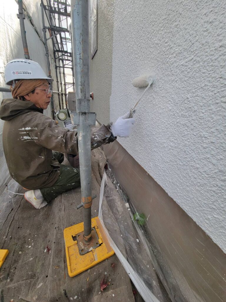 ベテラン職人さんがローラーを使って中塗りを進めている様子です!