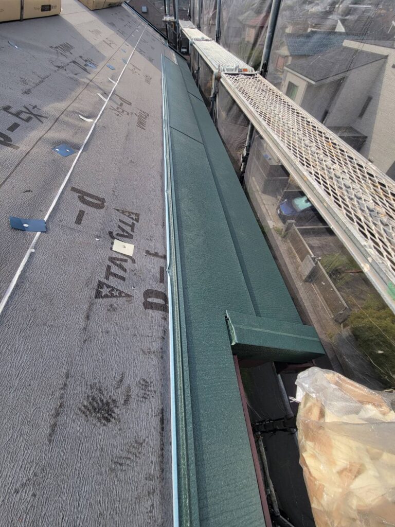 今回の施工は軒先から水平に屋根材を葺いていき、重ねるように上へと屋根材を葺いていく横葺き(よこぶき)という施工方法になります。