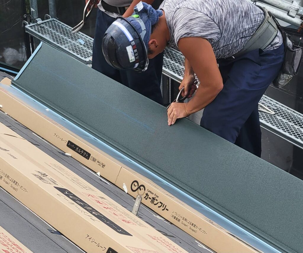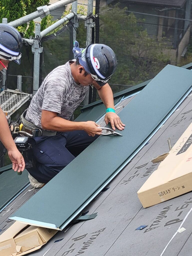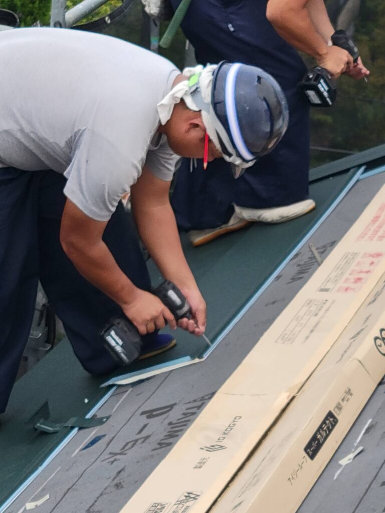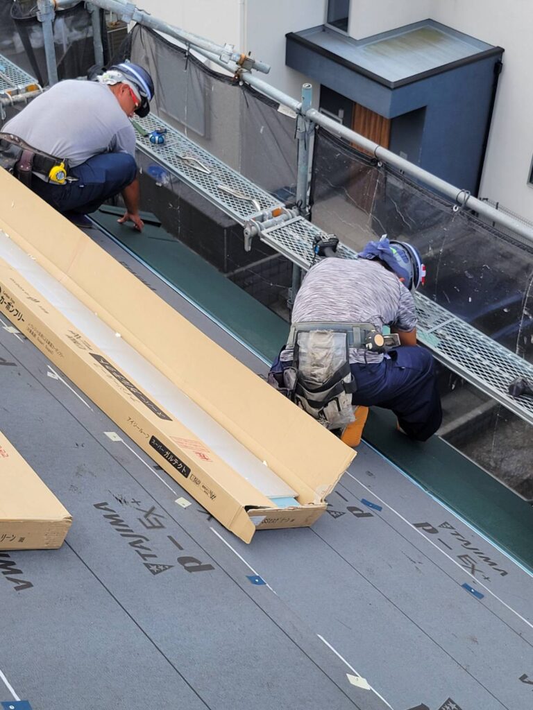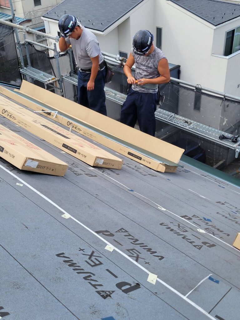 今回の施工は軒先から水平に屋根材を葺いていき、重ねるように上へと屋根材を葺いていく横葺き(よこぶき)という施工方法になります。