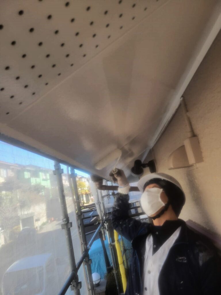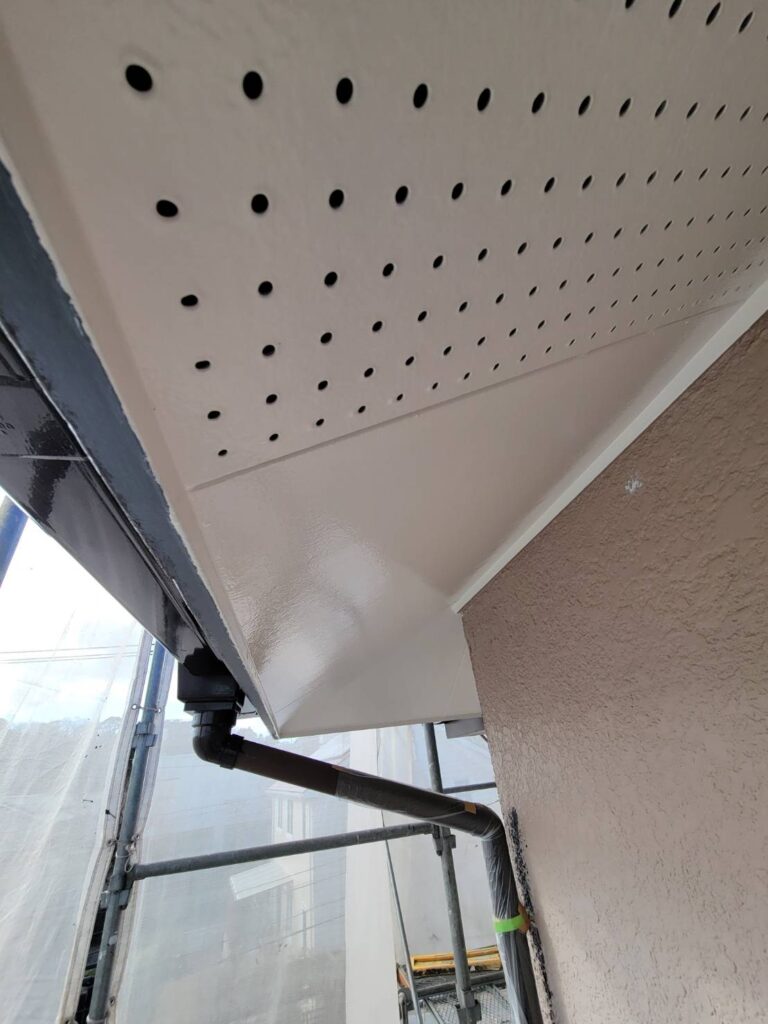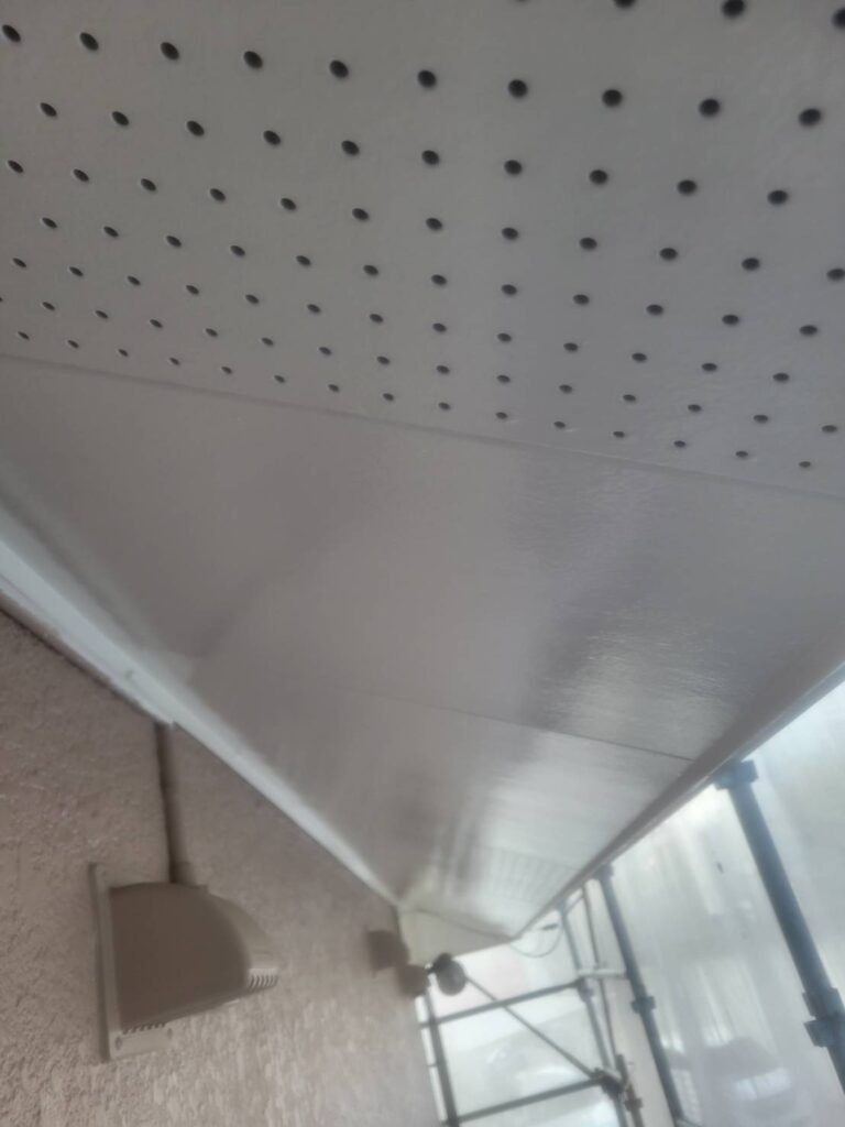 今回の軒天井は、有穴タイプ(小さな穴があいている天井材)でしたが、通気のための穴をしっかり残しながら塗装しています!