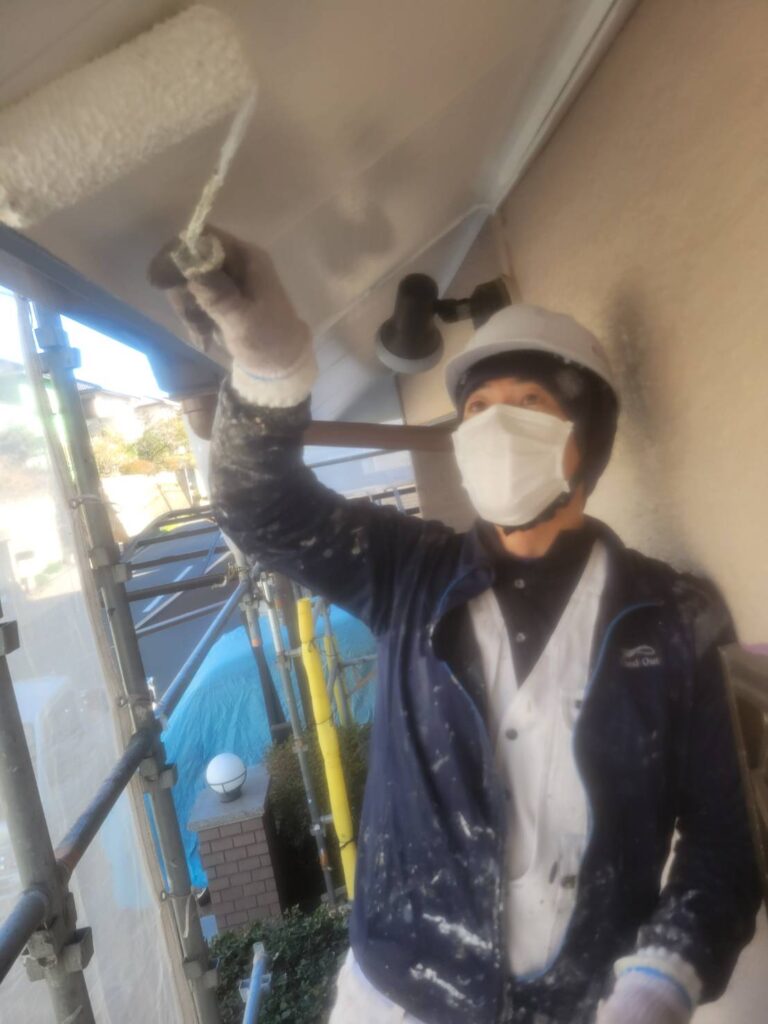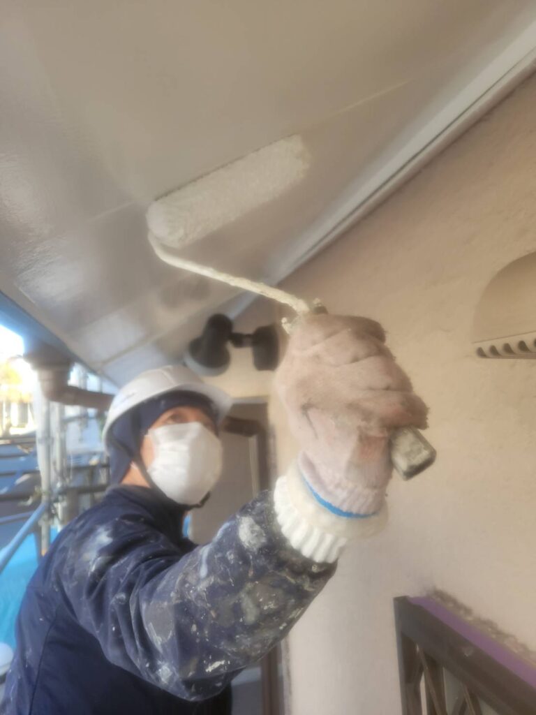 前回、外壁との境目や細かな部分を刷毛で先に塗装しておいた軒天井に、今回はローラーを使って全体を仕上げていきました!