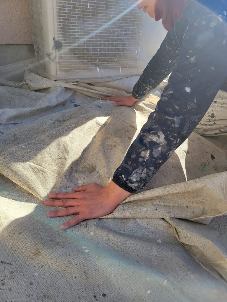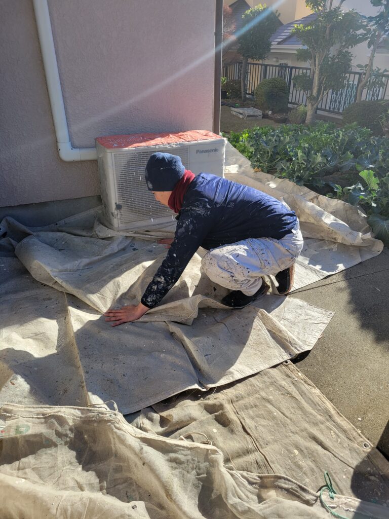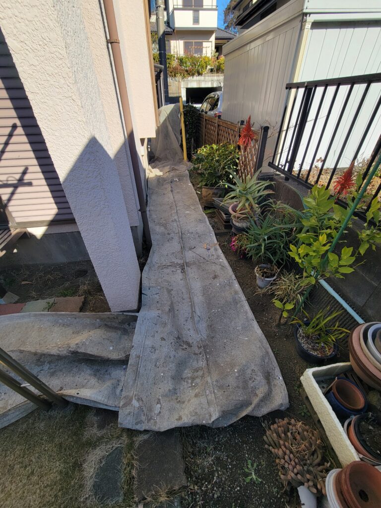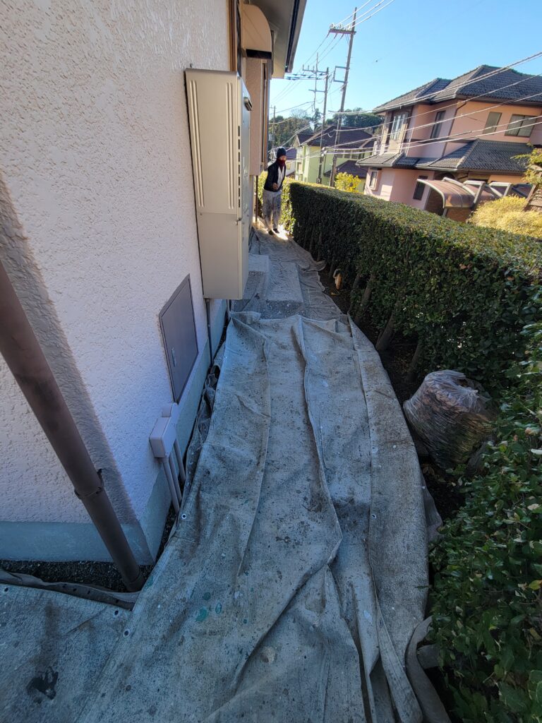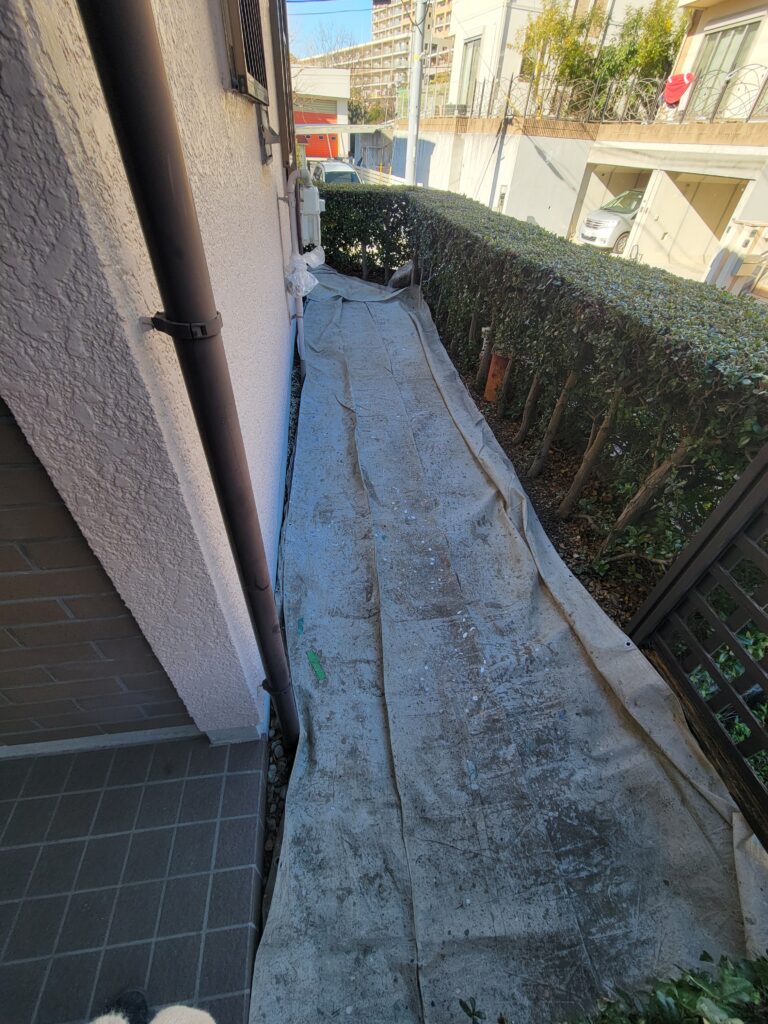 まだ塗装作業には入らず、着工前の準備として敷地まわりにシートを敷く作業を行いました!