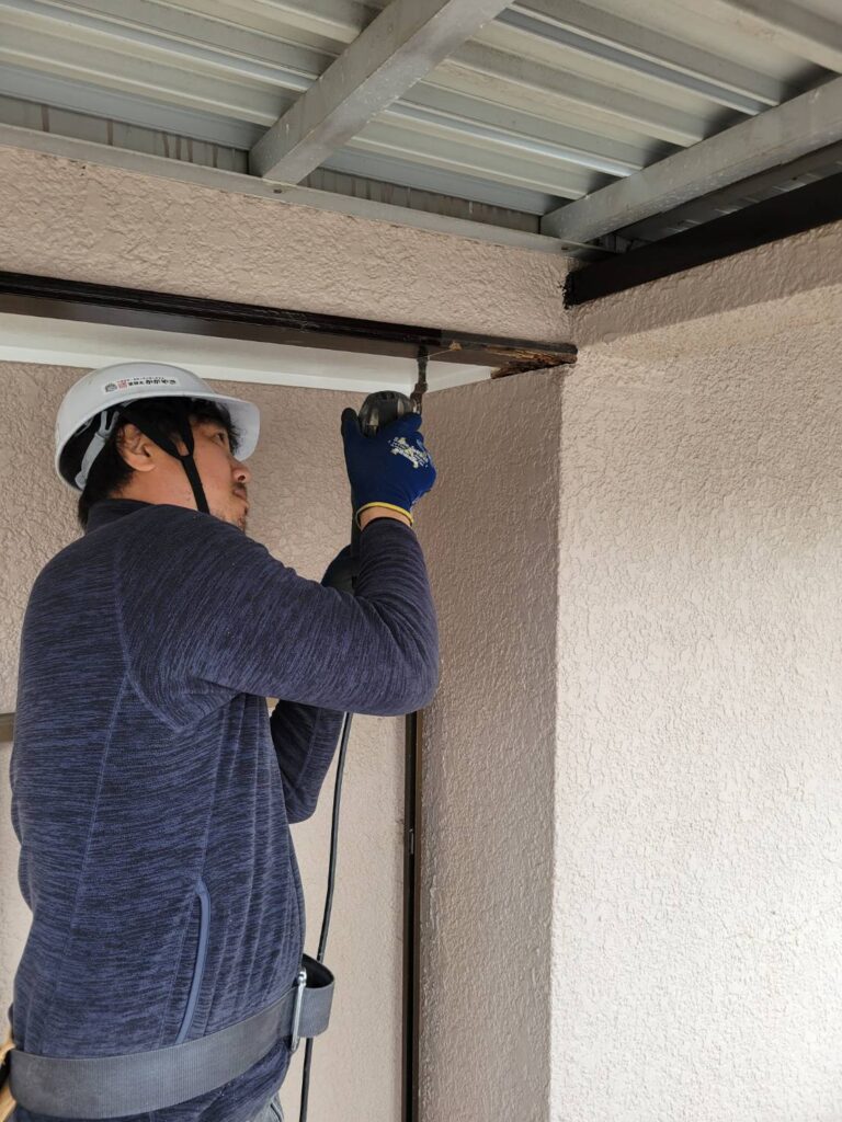 前回は同じベランダ下のモルタル補修を行いましたが、点検時に軒天の端部に腐食を確認しました!