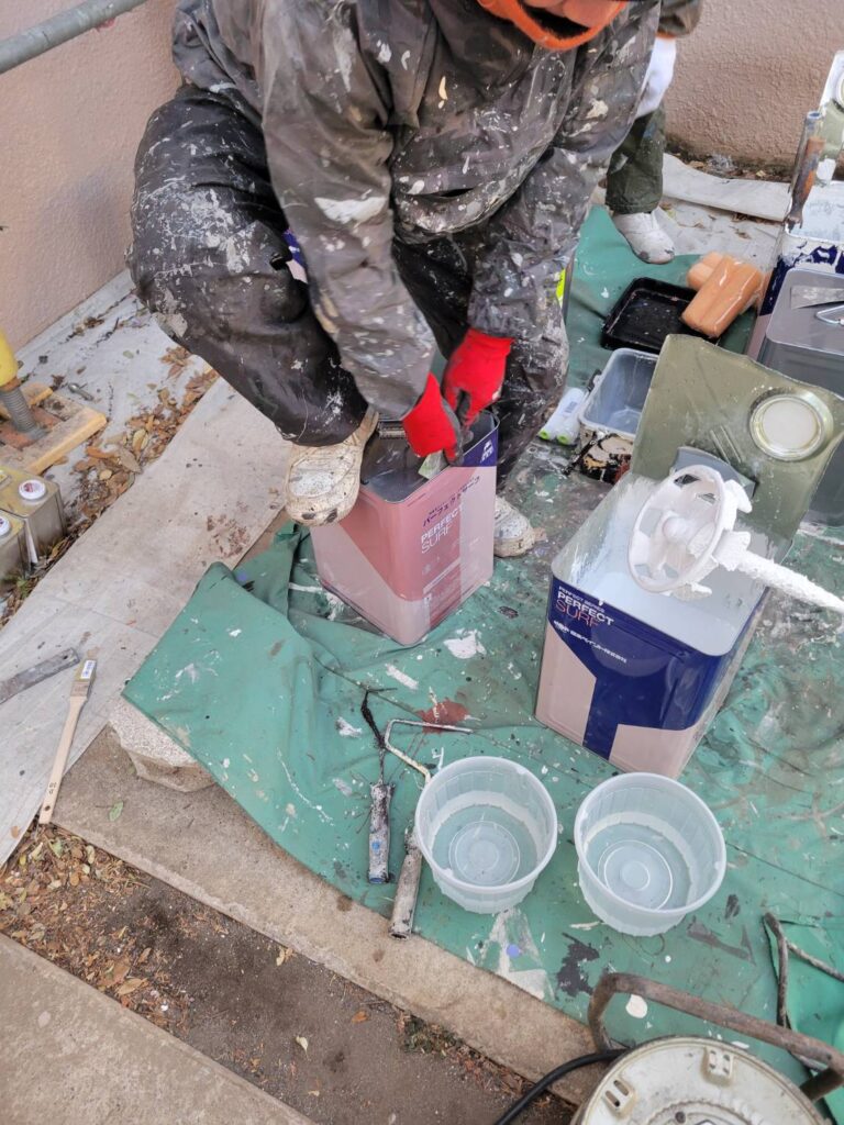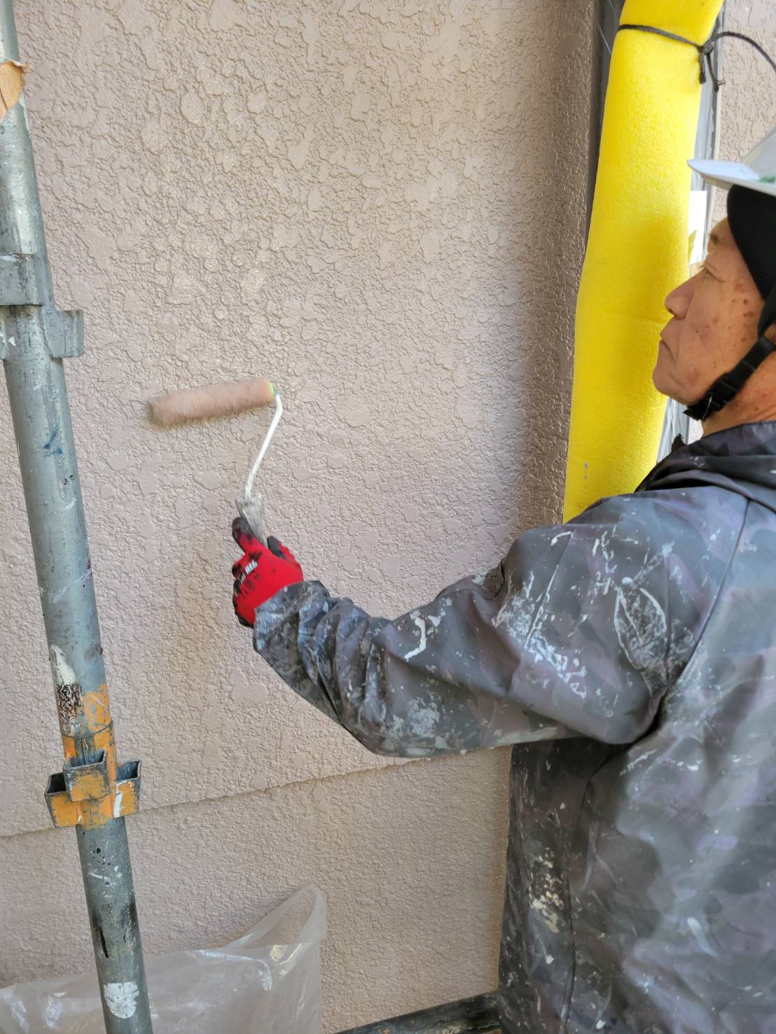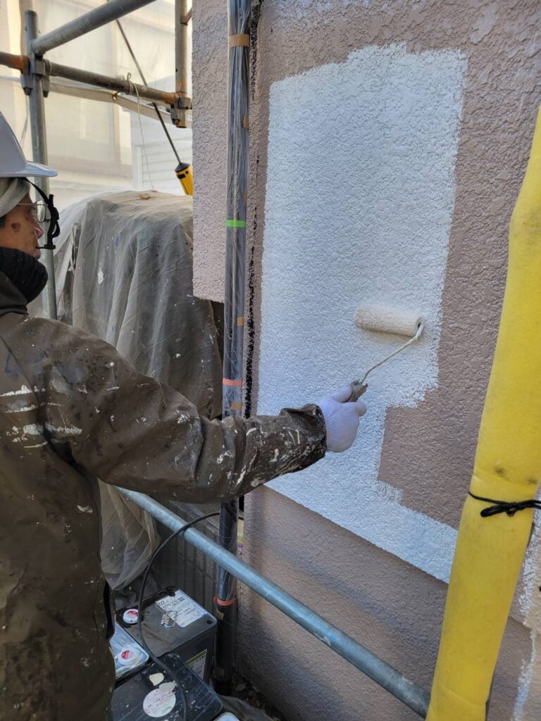 前回、現場で塗装した下塗り材は、エポキシ系シーラーは浸透性と付着力に優れ、既存下地を強固に固める役割があります!