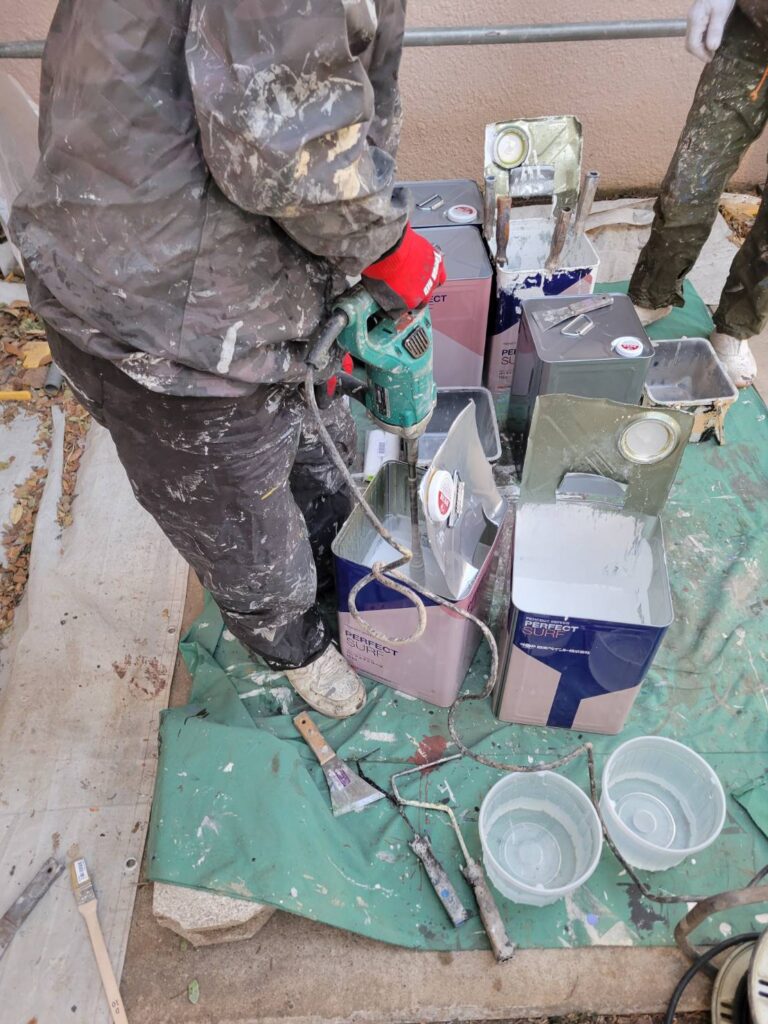 今回使用する中塗り塗料は下地調整と密着性向上を目的とした塗り材で、微弾性を持ちヘアクラック(細かなひび割れ)を埋めながら均一な塗膜をつくります!