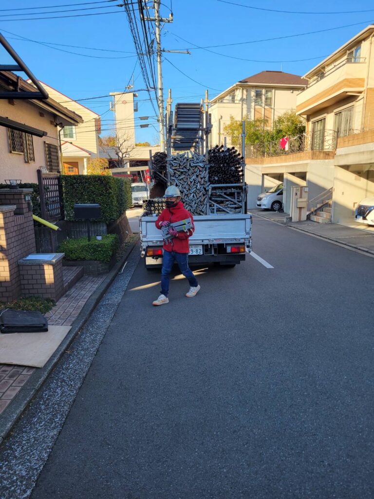 後日、足場屋さんが現場に到着し、足場組み立てに向けた準備を行います!