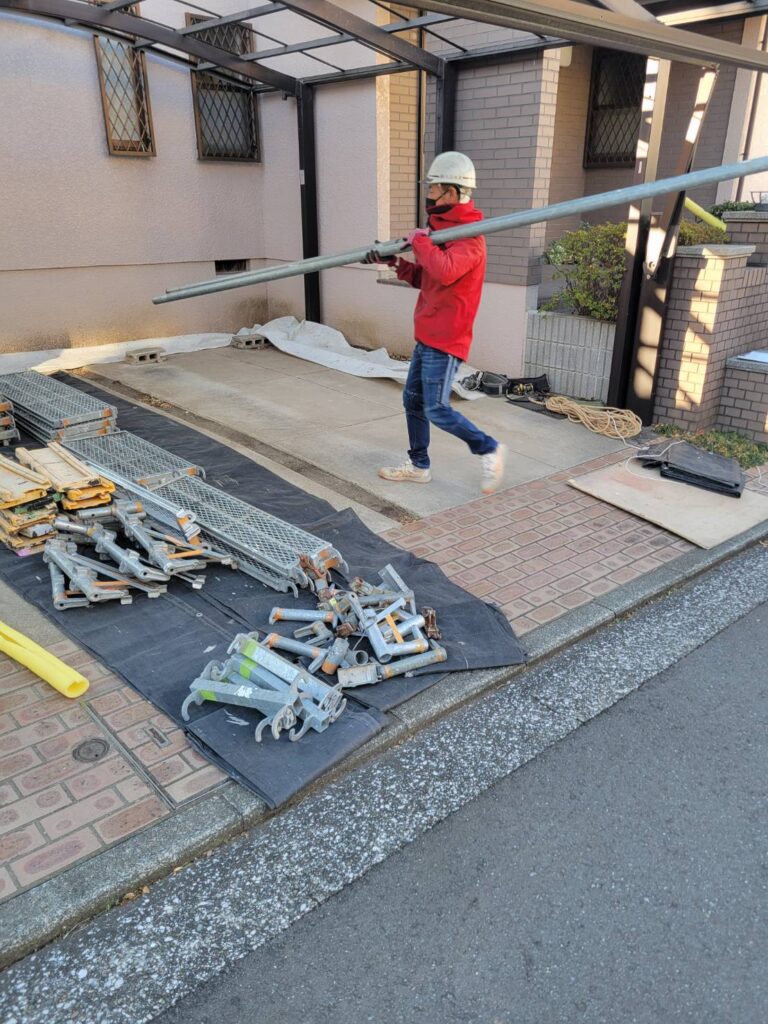 今回の現場には駐車場にカーポートが設置されており、そのままでは足場を立てることができないため、今日は足場着工前の準備作業からスタートしていきます!