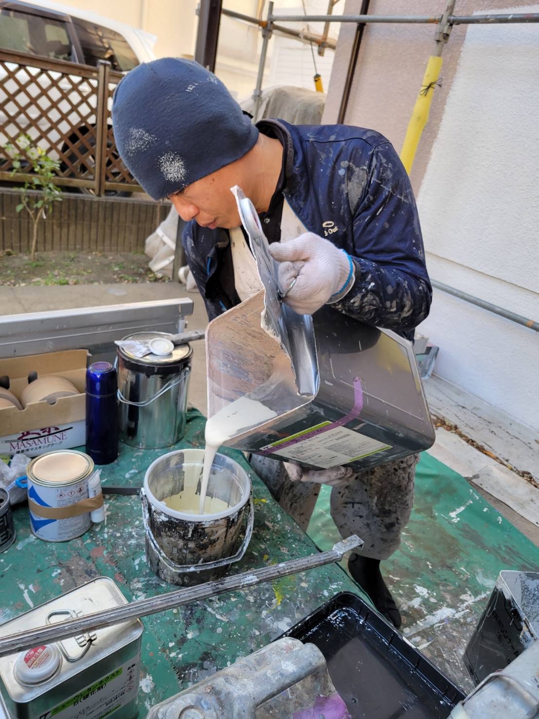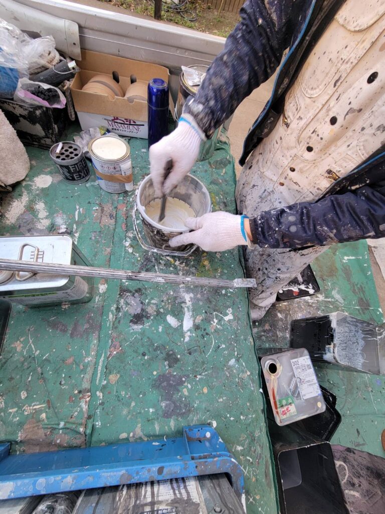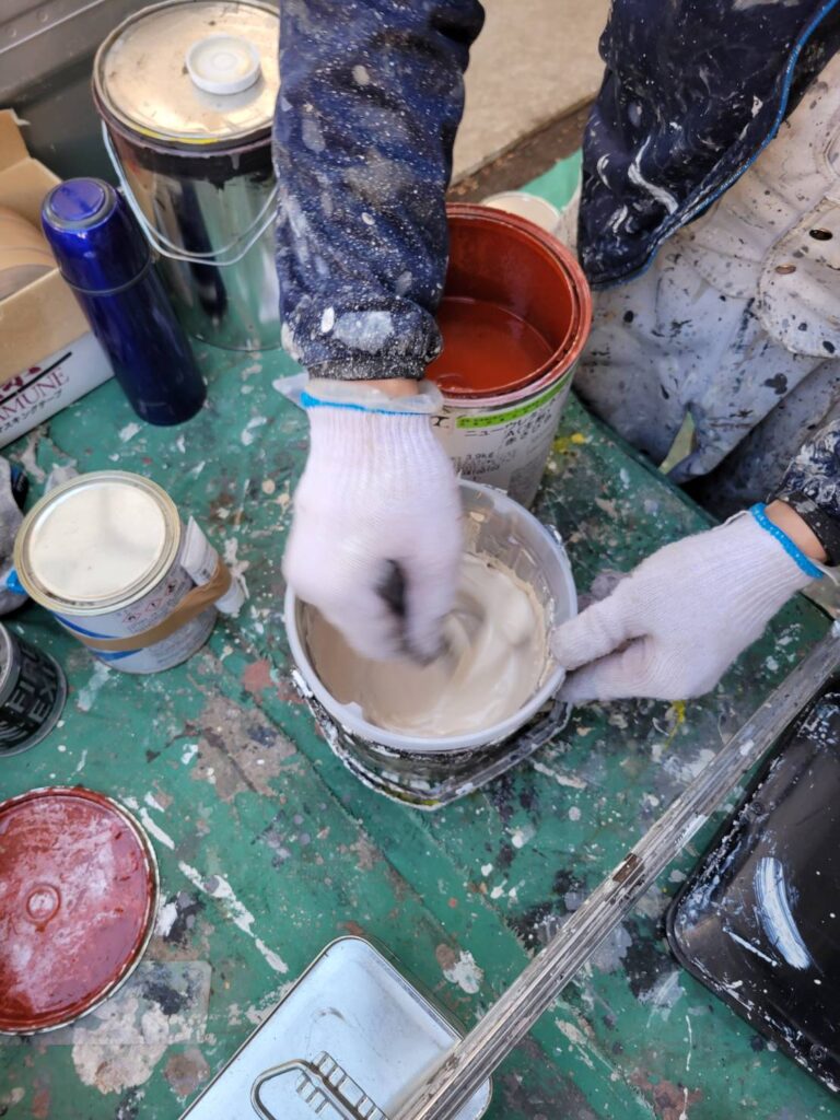 本来であれば材料を発注してからの施工になりますが、まずは手持ちの塗料を使い、色見本と照らし合わせながら色をつくっていきます!