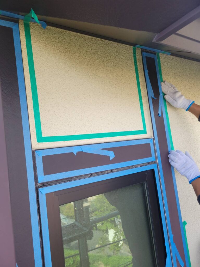 以前に貼った青いテープのほかに凹凸のある場所に貼れる緑のテープをコーキングする箇所に貼っています。