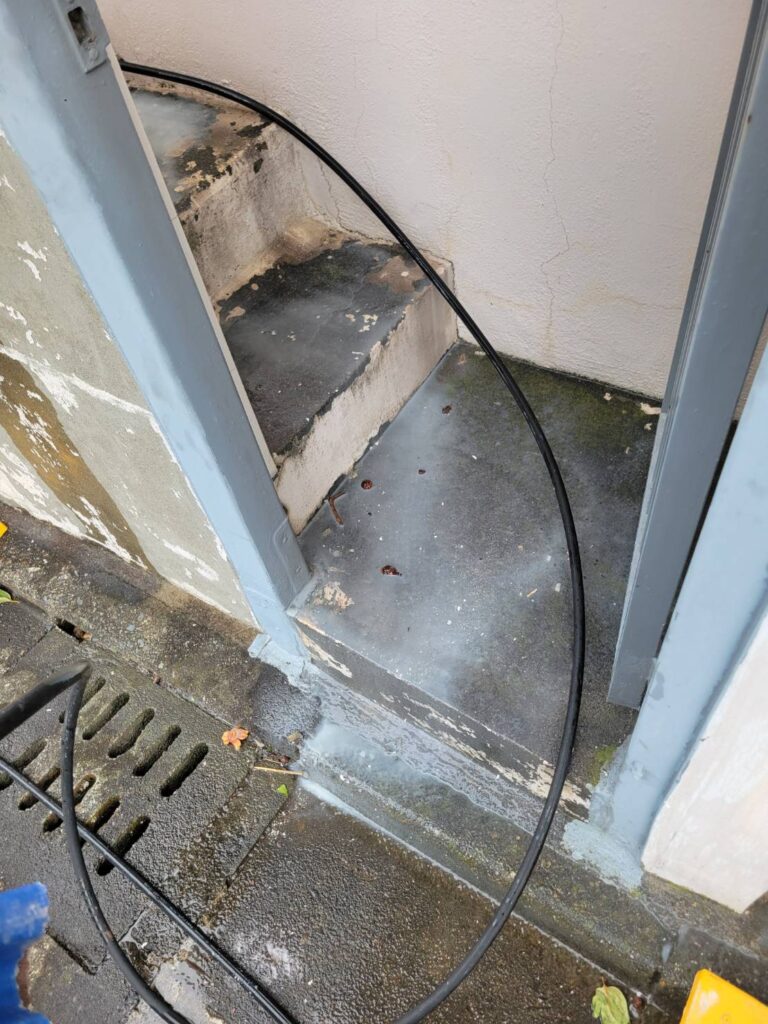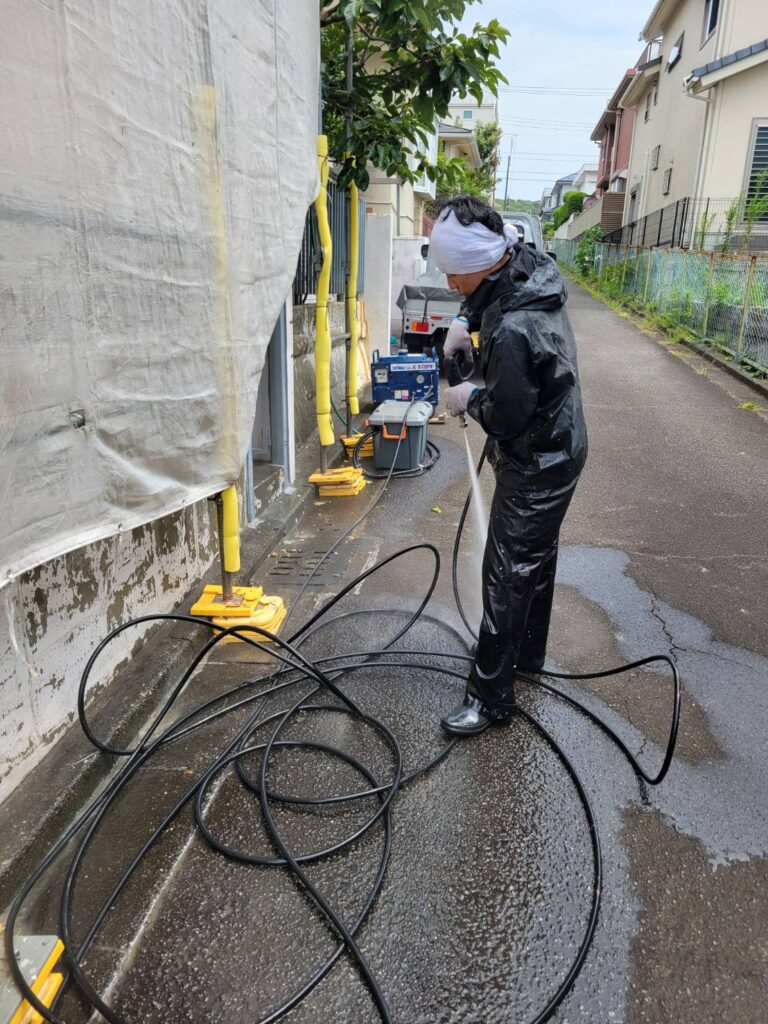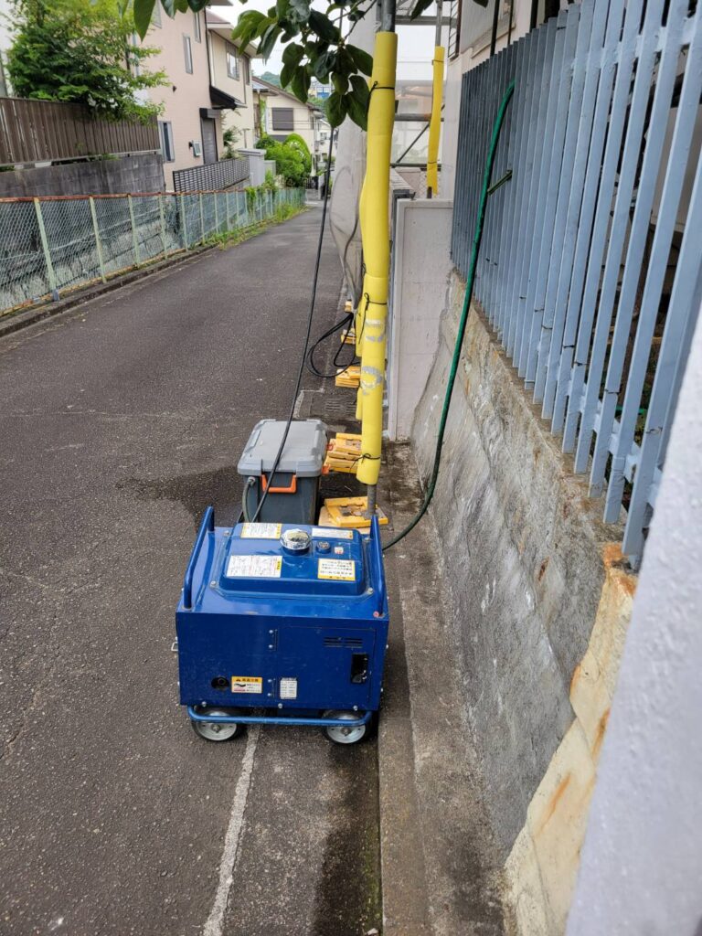 本日は高圧洗浄で外壁の汚れを落とす作業になります!