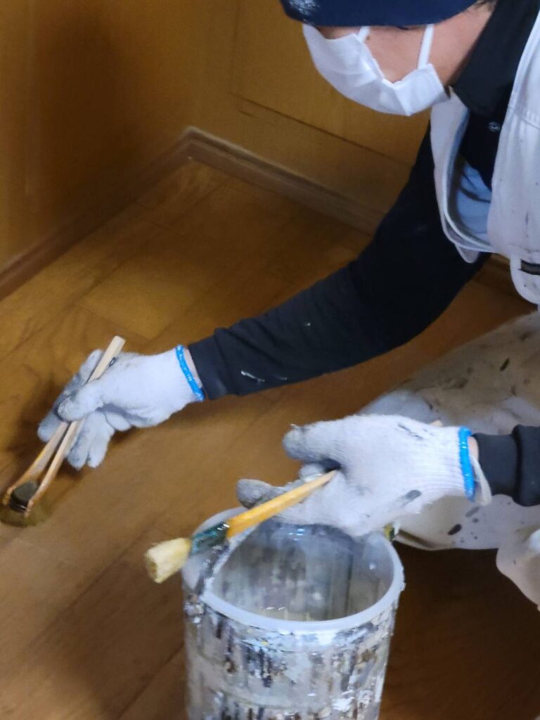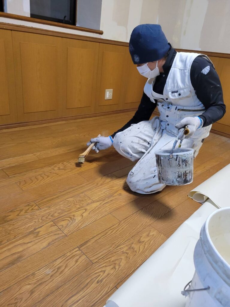 施工中は膝をつきながら1枚1枚板目を確認し、塗装にムラが出ないよう慎重に作業を進めていきます!