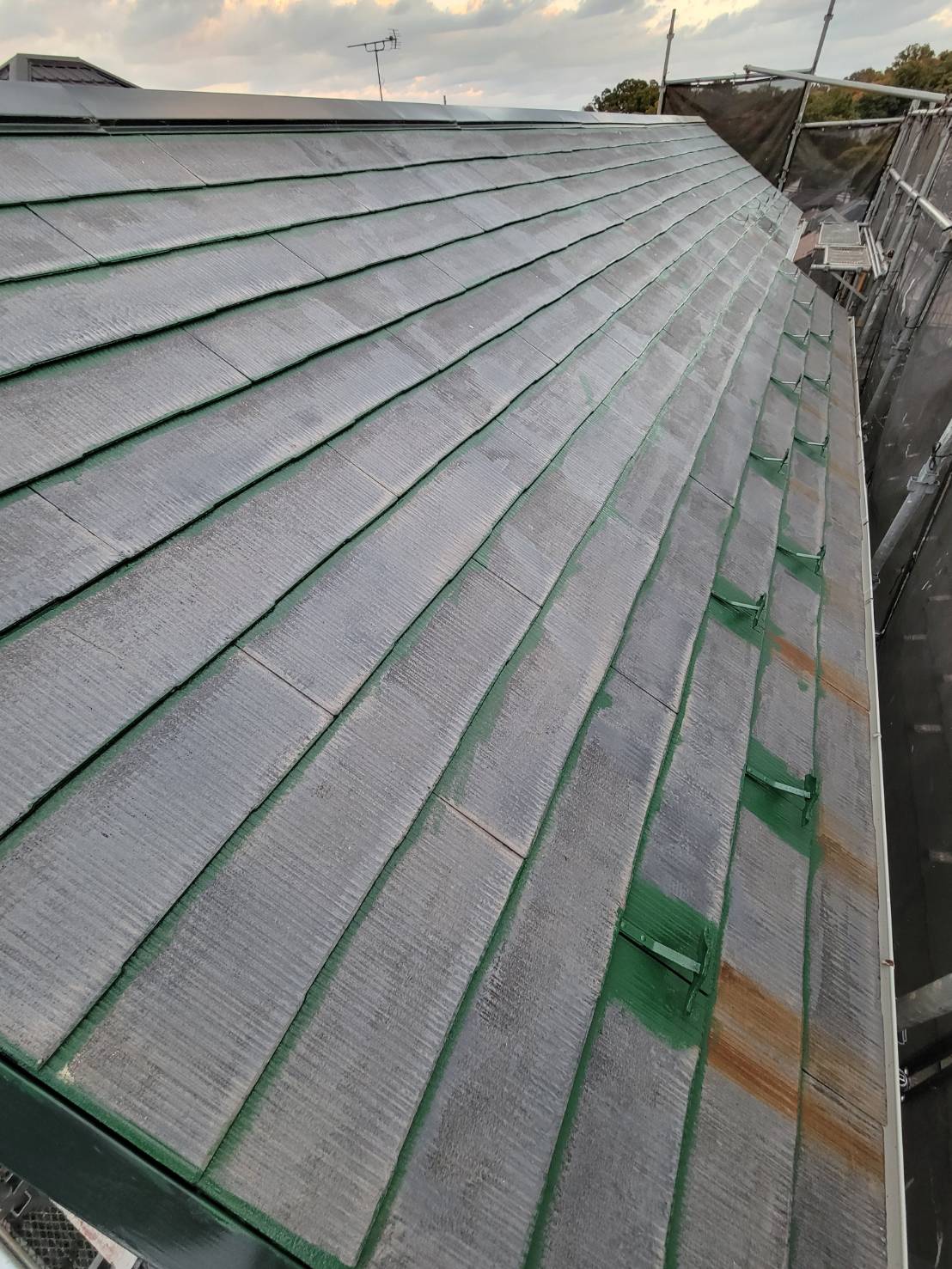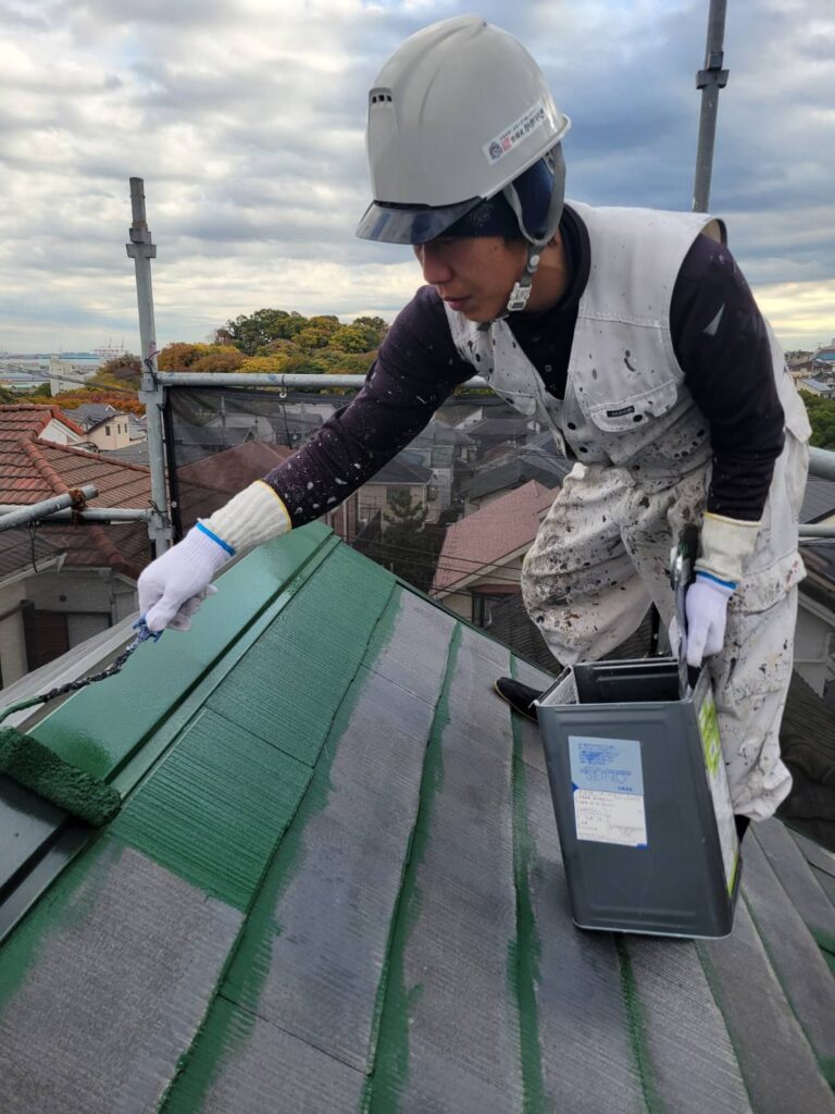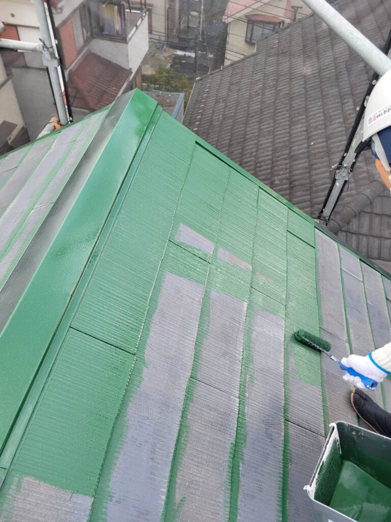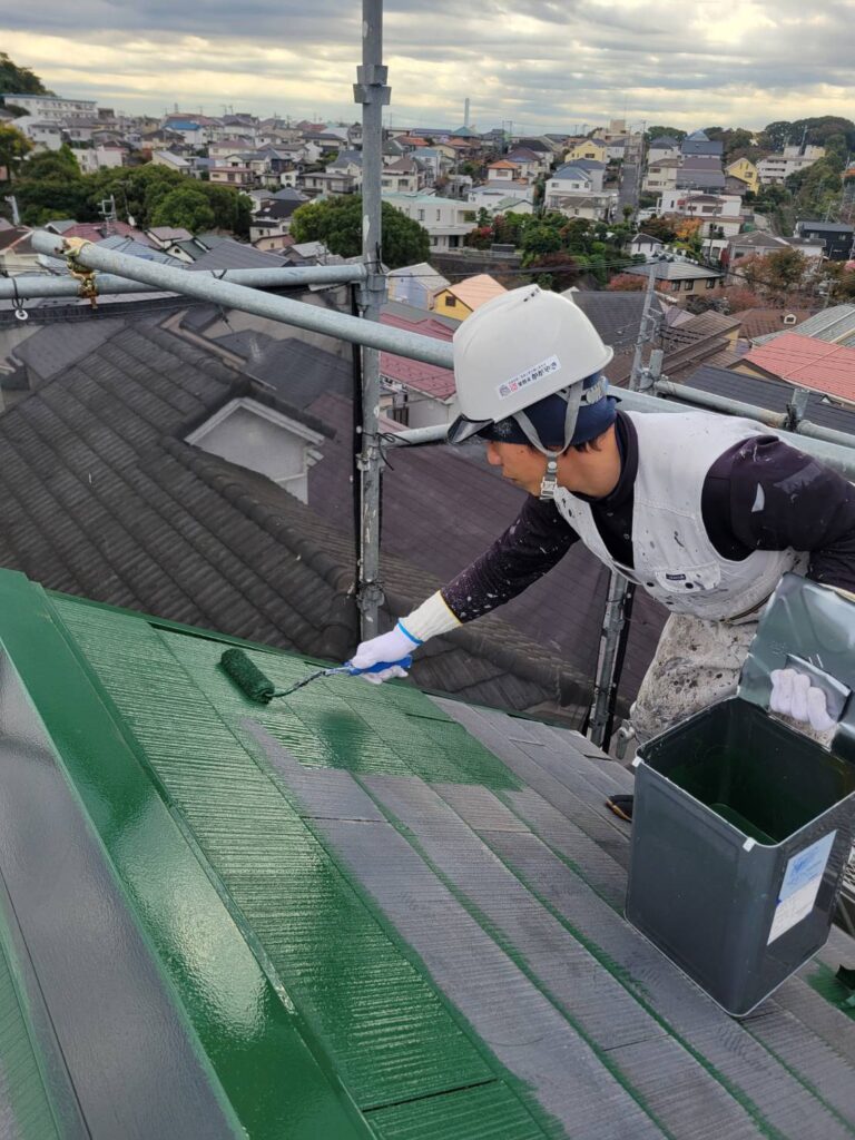 棟板金の際までしっかり塗り込み、仕上がりにムラを出さないよう丁寧に作業を進めています!