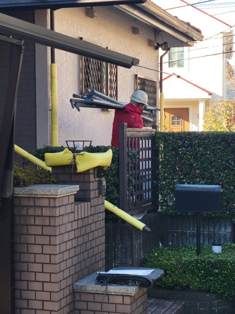 今回の現場は、敷地の正面に植栽や柵があり、限られた動線の中での作業となります!