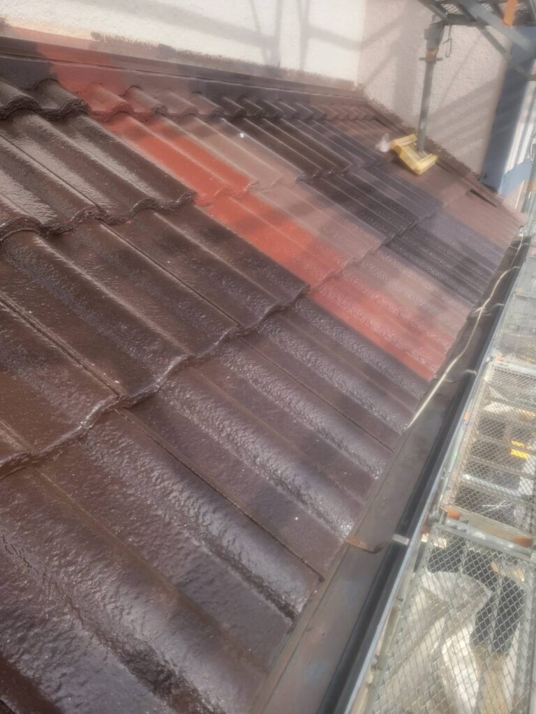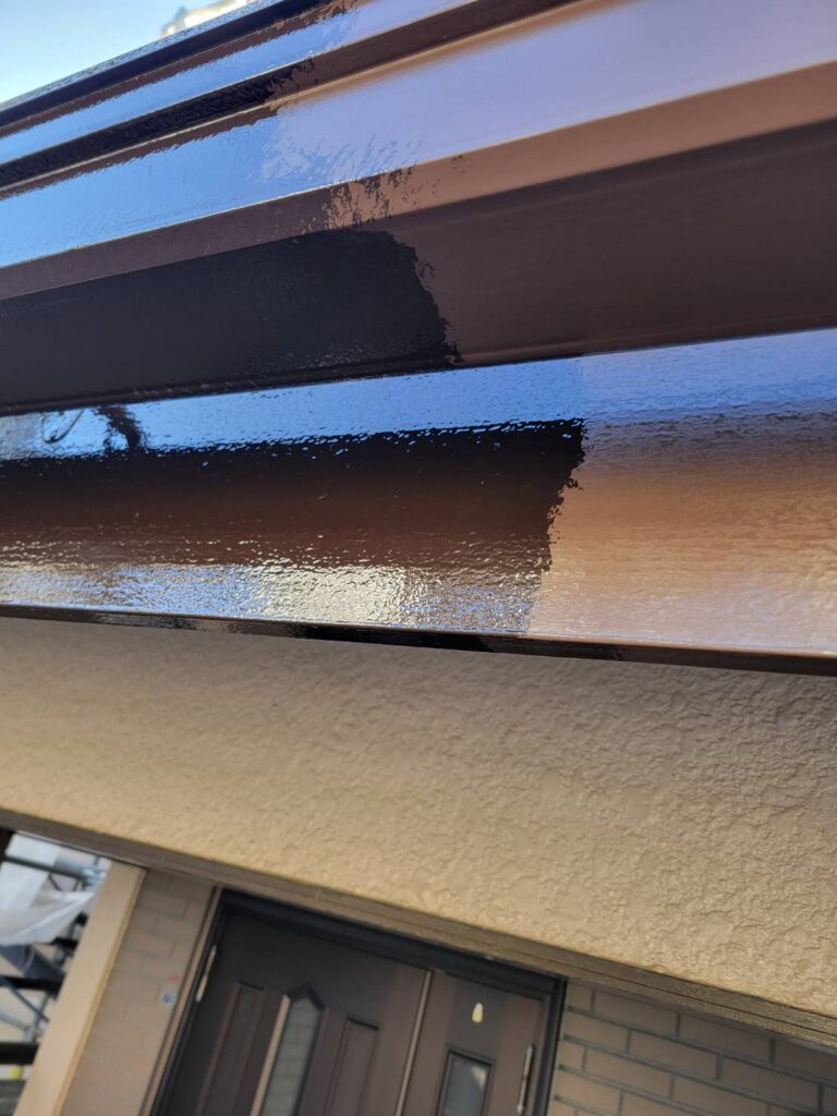 能見台の住宅街にて施工中!色選びで後悔しないために下屋根・付帯部に試し塗りです!