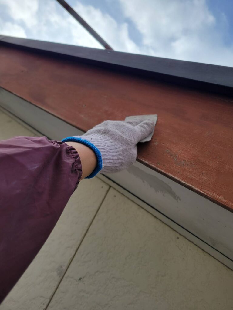 今回の現場では、ガルバリウム鋼板の屋根、木製の破風板、鉄製の雨戸など、さまざまな素材があるため、それぞれの素材に合わせたケレンを丁寧に行っていきます!