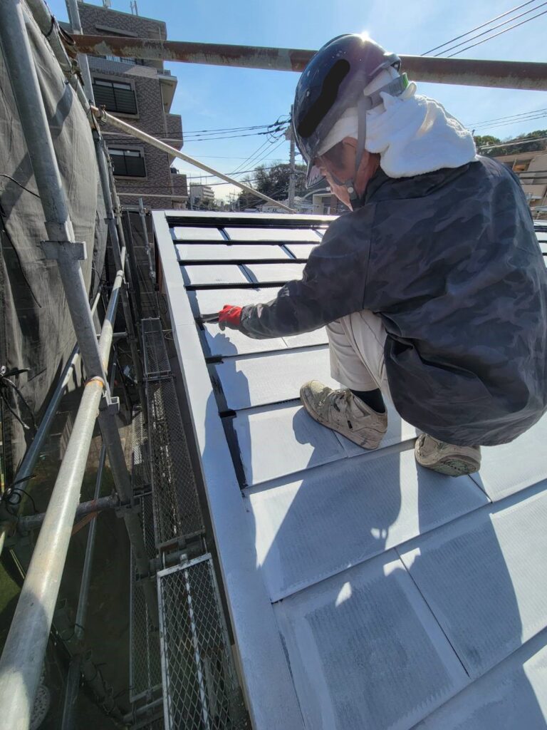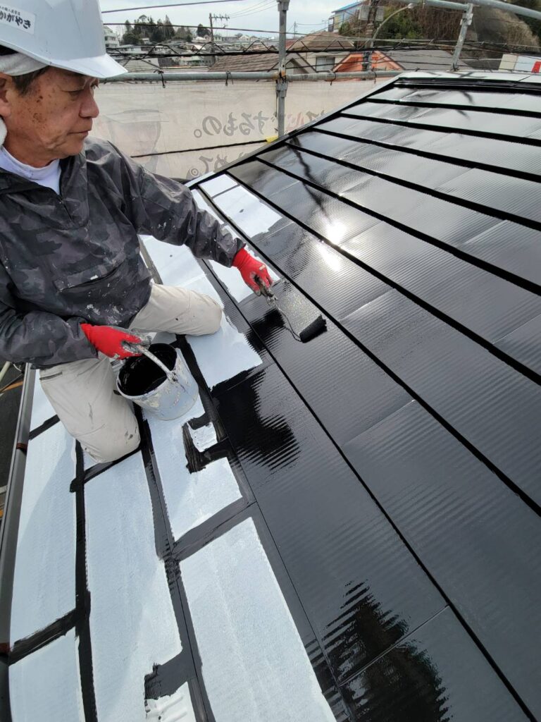 ローラーを使い、屋根材の形状に合わせて塗り残しが出ないよう作業を進めていきます!