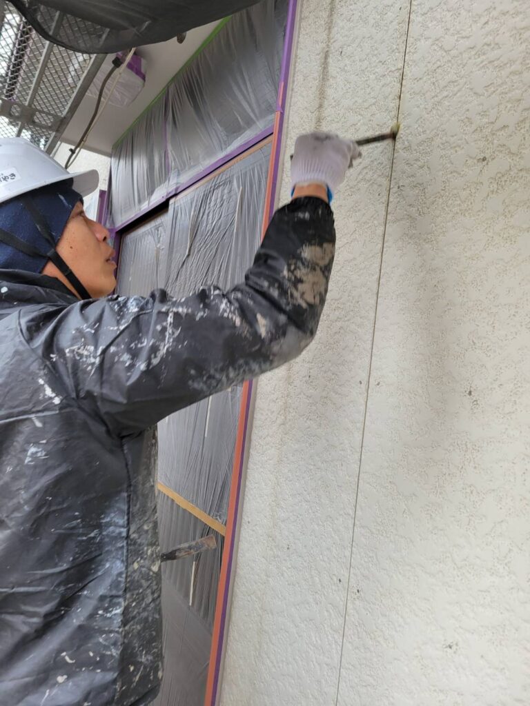 今回の外壁はサイディング特有の繋ぎ目に溝がある仕様となっているため、いきなりローラーで塗装するのではなく、まずは刷毛を使って細部から丁寧に塗り込んでいきます!