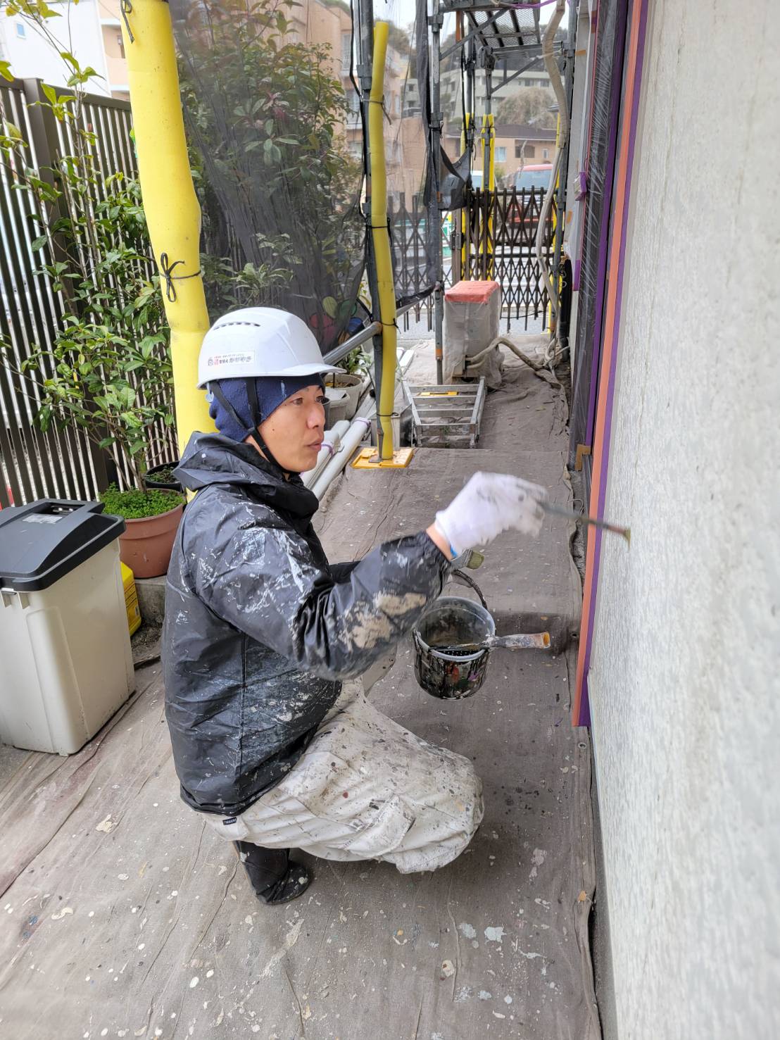 細部の塗装が完了した後、ローラーを使用して外壁全体にシーラーを塗り広げていきます!