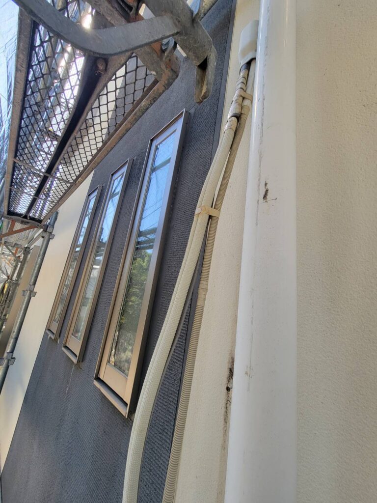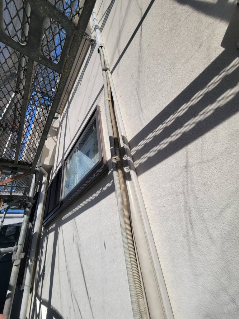 今回の工程では、外壁塗装に伴いエアコンカバー(配管カバー)の取り外し作業を行いました!対象となるのは計3箇所で、いずれも外壁に沿って設置されている配管を保護する重要な部材です!