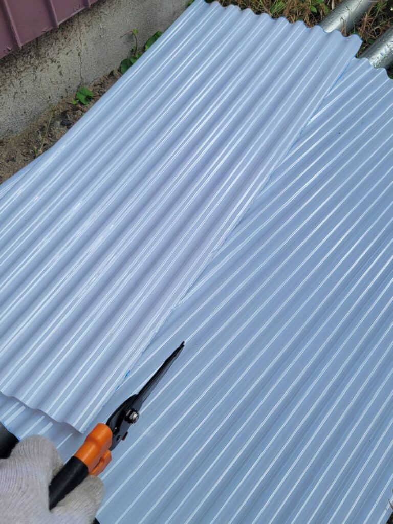 まずは、給湯器まわりのスペースを確保するため、取り付け位置を確認しながら波板を専用ハサミでカットして加工。