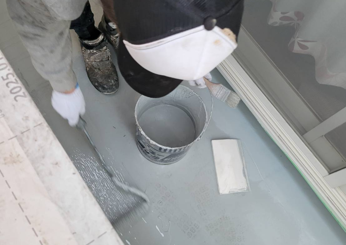 防水工事の下塗り材といのうは「ボンド」のような役割があります。つまり、中塗り材とくっつけて防水層を作るために大事な工程です。 塗り残しが無いように、隅々まで塗っていきます。