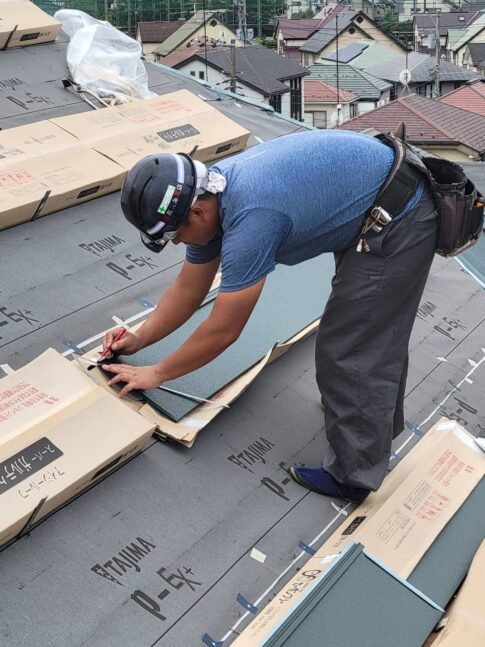 現場親方ブロググリーンの屋根材です こんにちは!外壁塗装に情熱を燃やす塗替えかがやき代表の小川です!金沢区の富岡西・住宅街にて施工をさせていただいています! 前回、役物の取付が終わったので今度は屋根材を付けていきます!因みに屋根材を付...